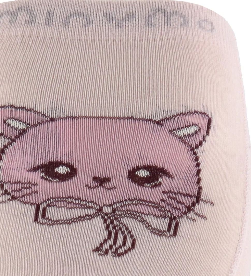 Flotte Minymo strømpebukser i rosa, og bagpå er der et stort print med en kat i mørk rosa og bordeaurød. Ned ad siderne på benene er der et diskret hulmønster. Minymo strømpebukserne har en elastisk talje for en sikker pasform.