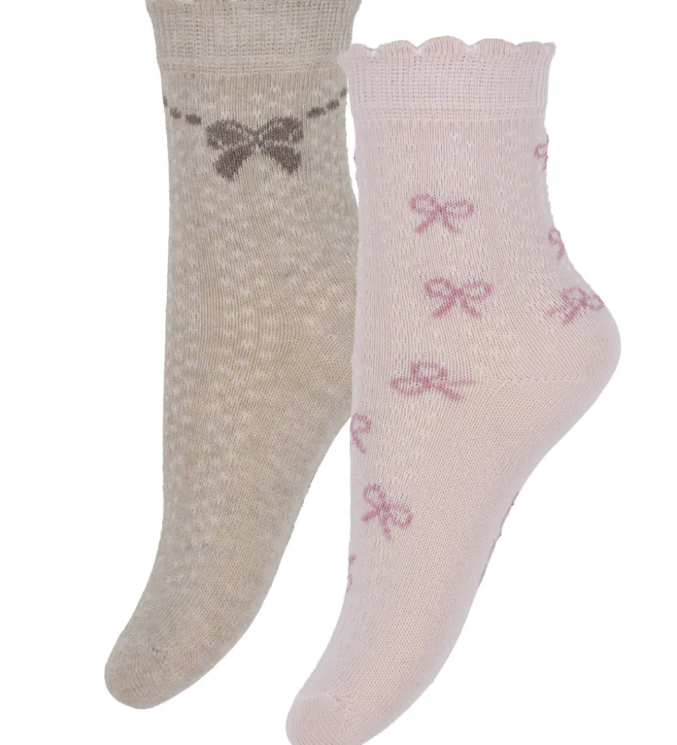 Fine Minymo strømper solgt i en 2-pak. Det ene par er meleret beige med hvide prikker og en brun sløjfe øverst på skaftet, og det andet par er rosa med hvide prikker og små mørkrosa sløjfer.