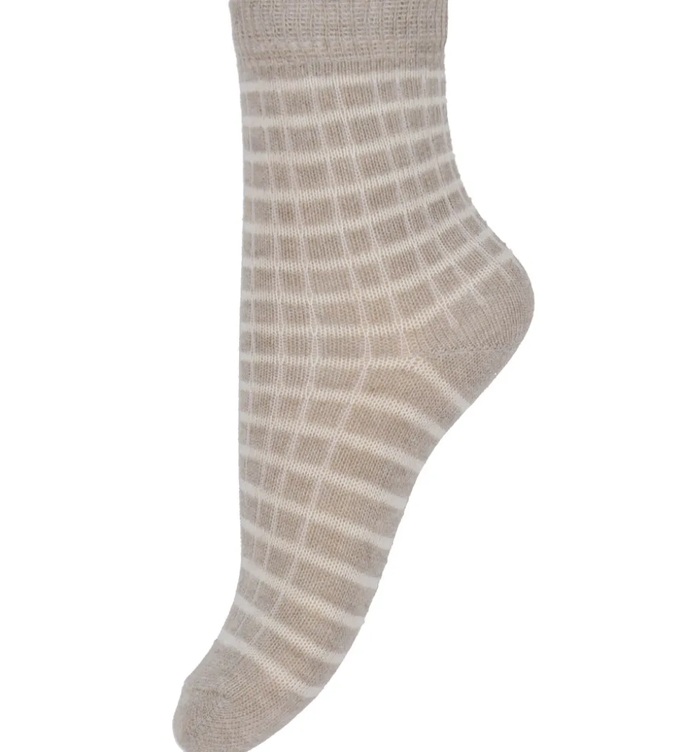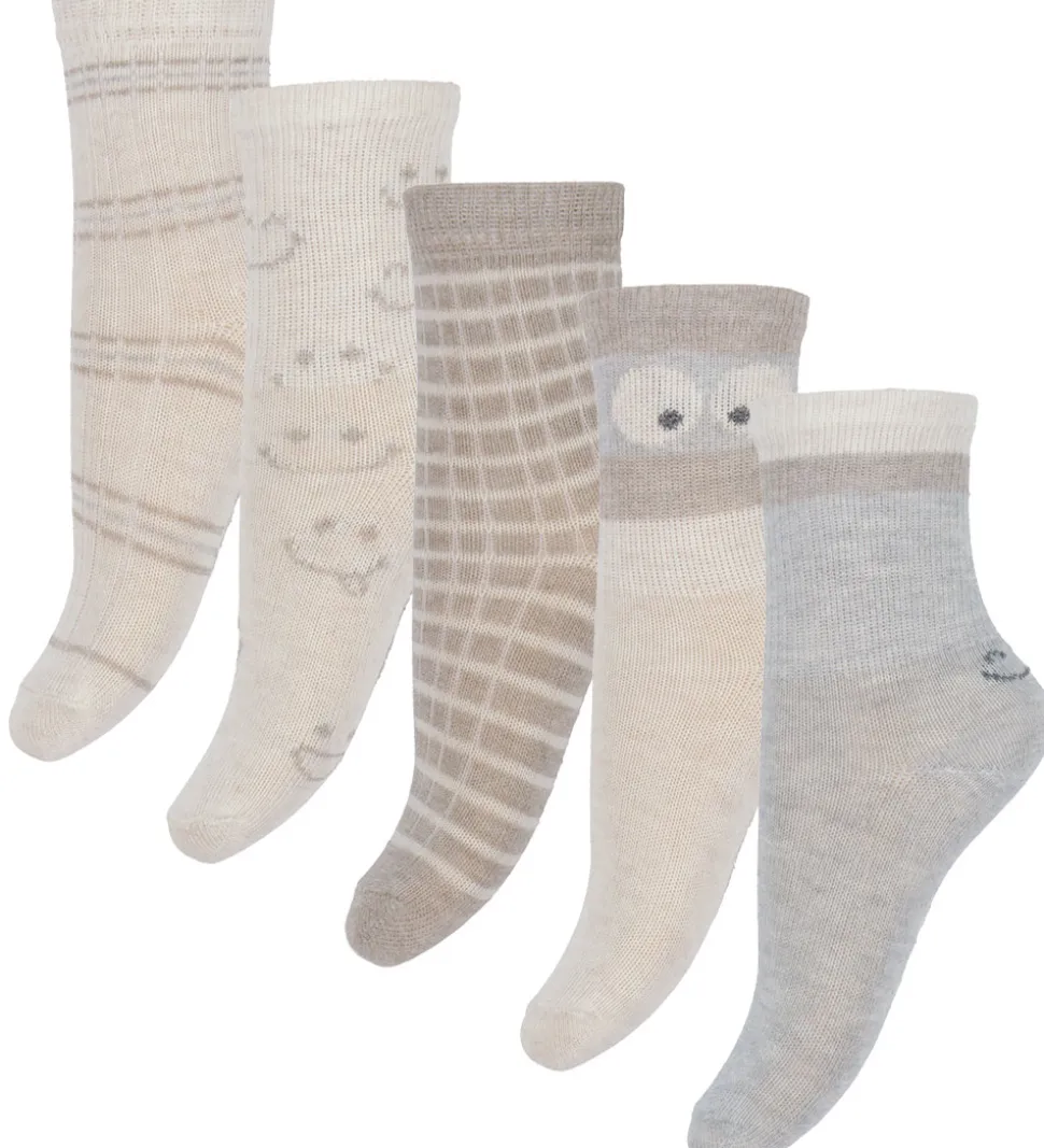 Lækre Minymo strømper solgt i en 5-pak med fem forskellige designs i meleret lys beige med detaljer i lysebrun og meleret grå.