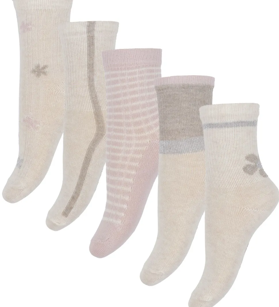 Søde Minymo strømper solgt i en 5-pak i fem forskellige designs i meleret lys beige med detaljer i brun, rosa og sølv med glimmer.