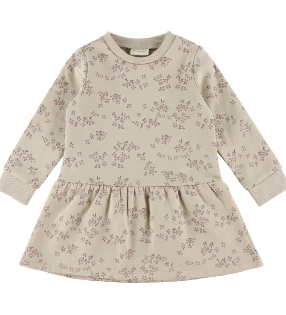 Flotte Minymo kjoler solgt i en 2-pak i en blød lilla nuance samt en beige variant med fint blomstertryk i lyslilla nuancer. Minymo kjolerne har lange ærmer og rund halsudskæring.