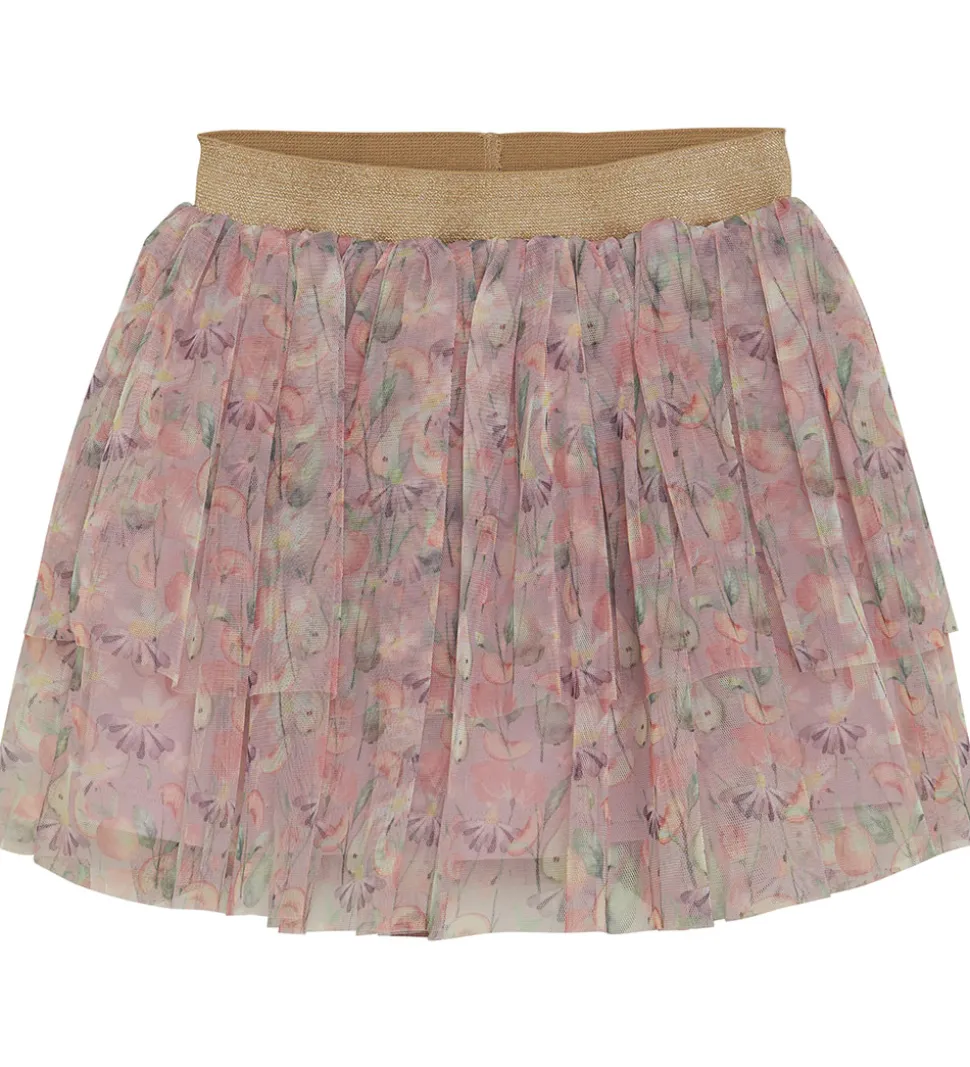 Smuk Minymo nederdel i lys tyl farve med delikat blomsterprint. Nederdelen har smukke lag og en elastisk, gylden talje, der giver en sød og festlig silhuet. På indersiden er der et ekstra lag i rosa bomuldsjersey.