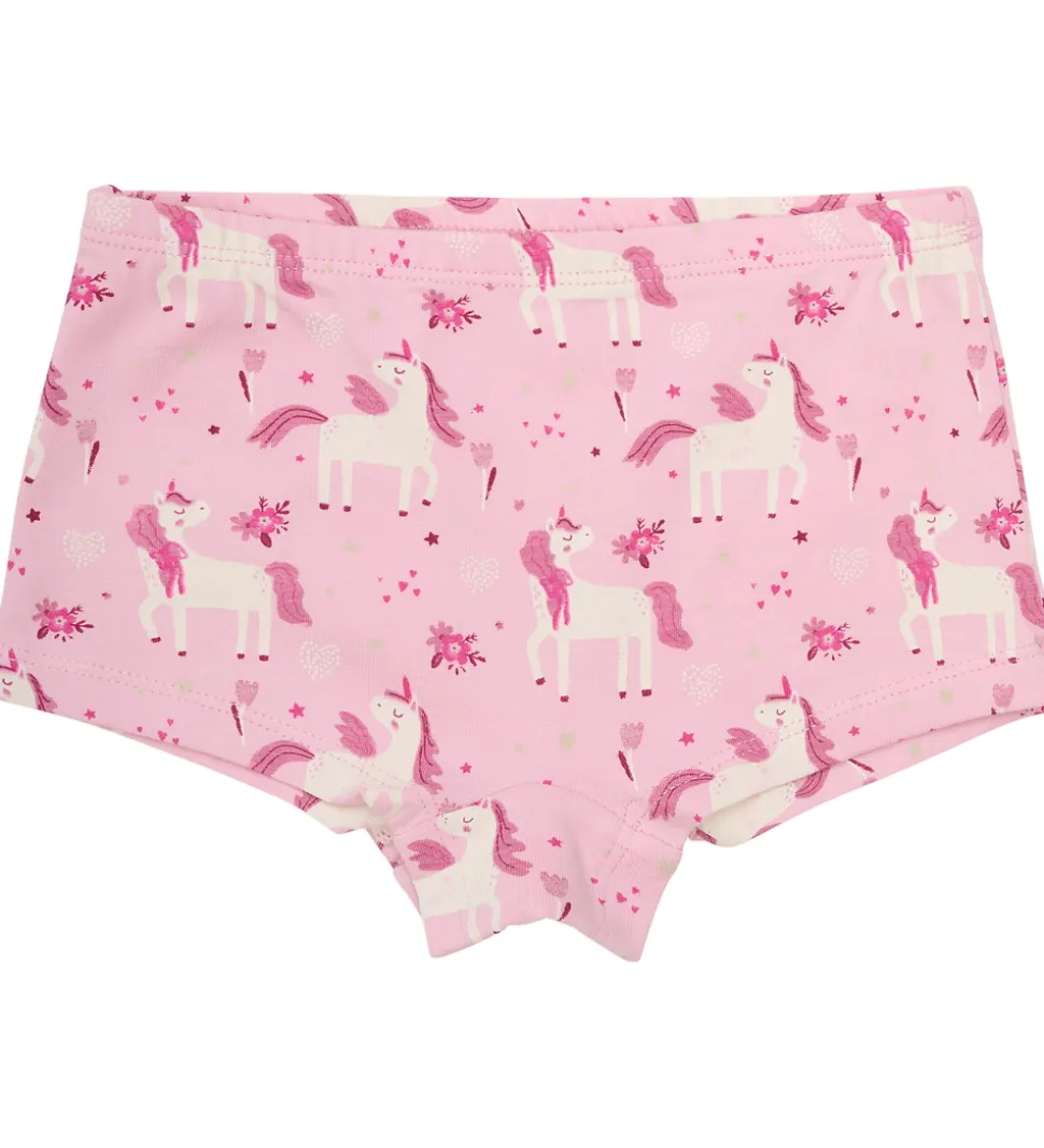 Praktiske Minymo trusser solgt i en 2-pak med en ensfarvet lyserød og en med et alloverprint af enhjørninger. Minymo trusserne har en elastikkant i livet, som sørger for god pasform.