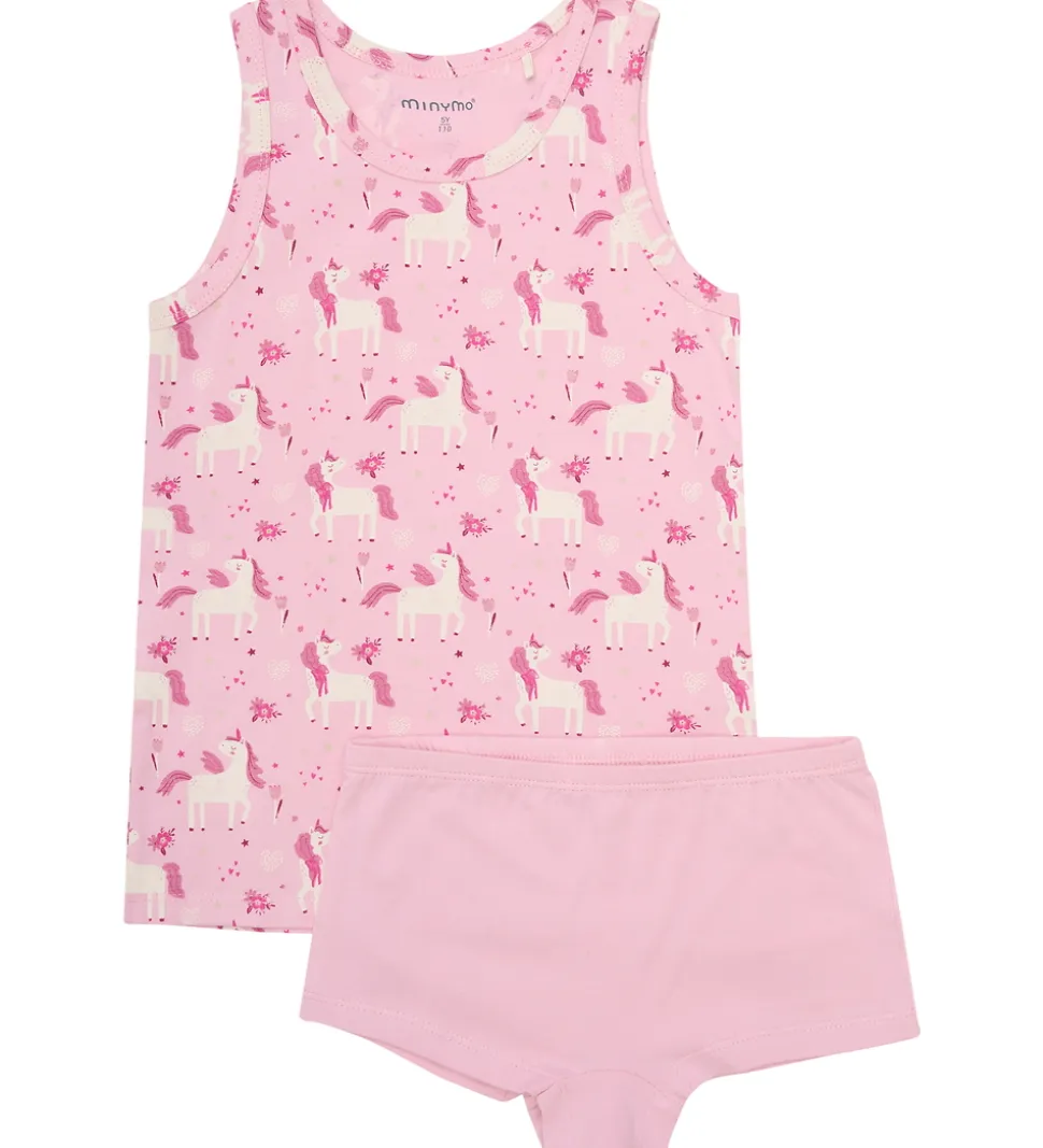 Dejligt Minymo undertøj i en lys rosa. Overdelen har et charmerende enhjørningeprint, mens underdelen er ensfarvet. Minymo kombinerer komfort og stil i dette sæt, der sikkert vil begejstre.