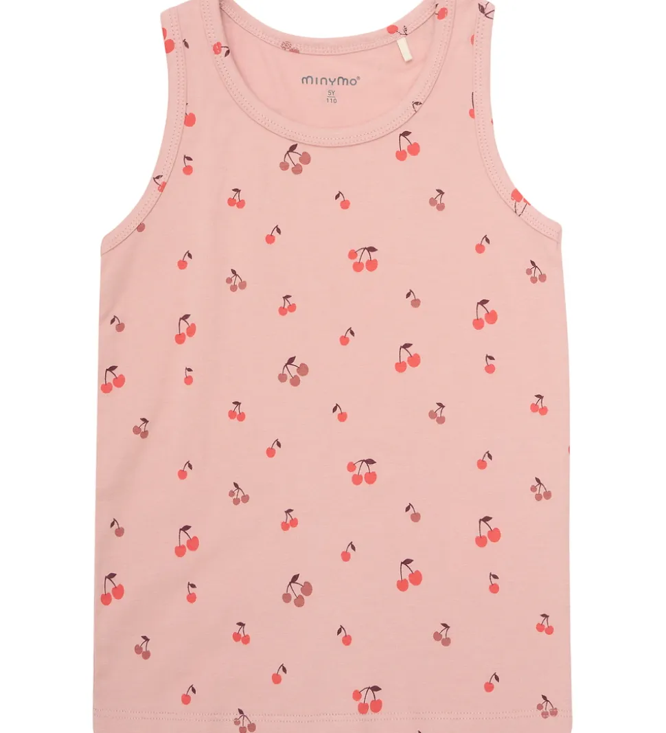 Charmerende Minymo undertøj med en top i lyserød dekoreret med fine kirsebærprint. Minymo toppen er uden ærmer, hvilket gør den behagelig på varme dage. Perfekt til at sætte et legende præg.
