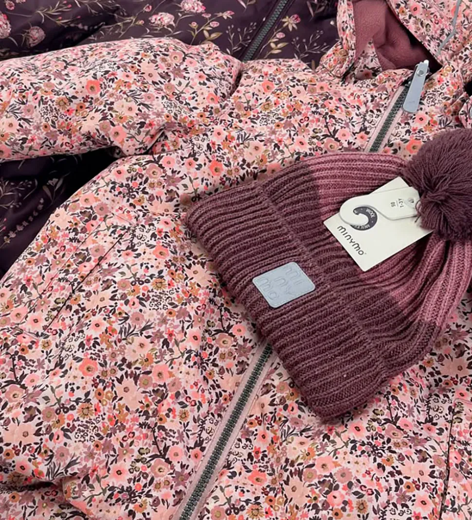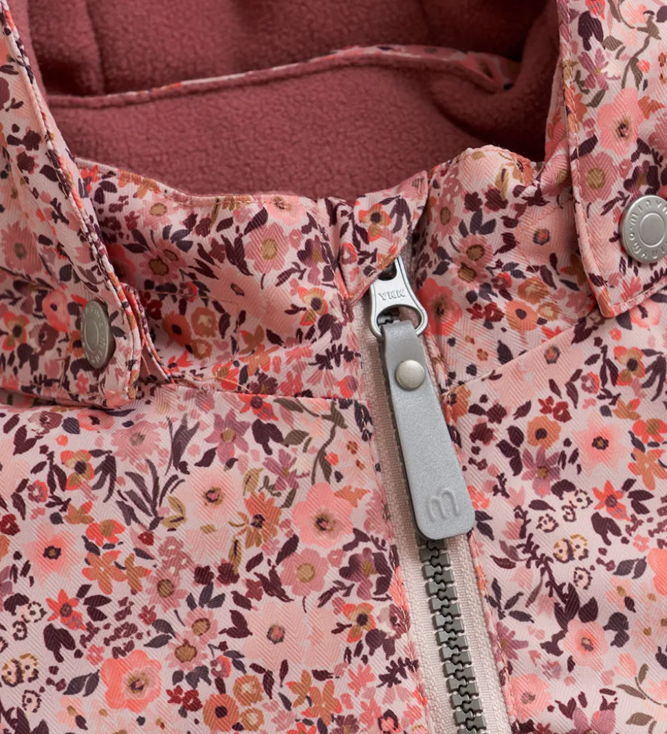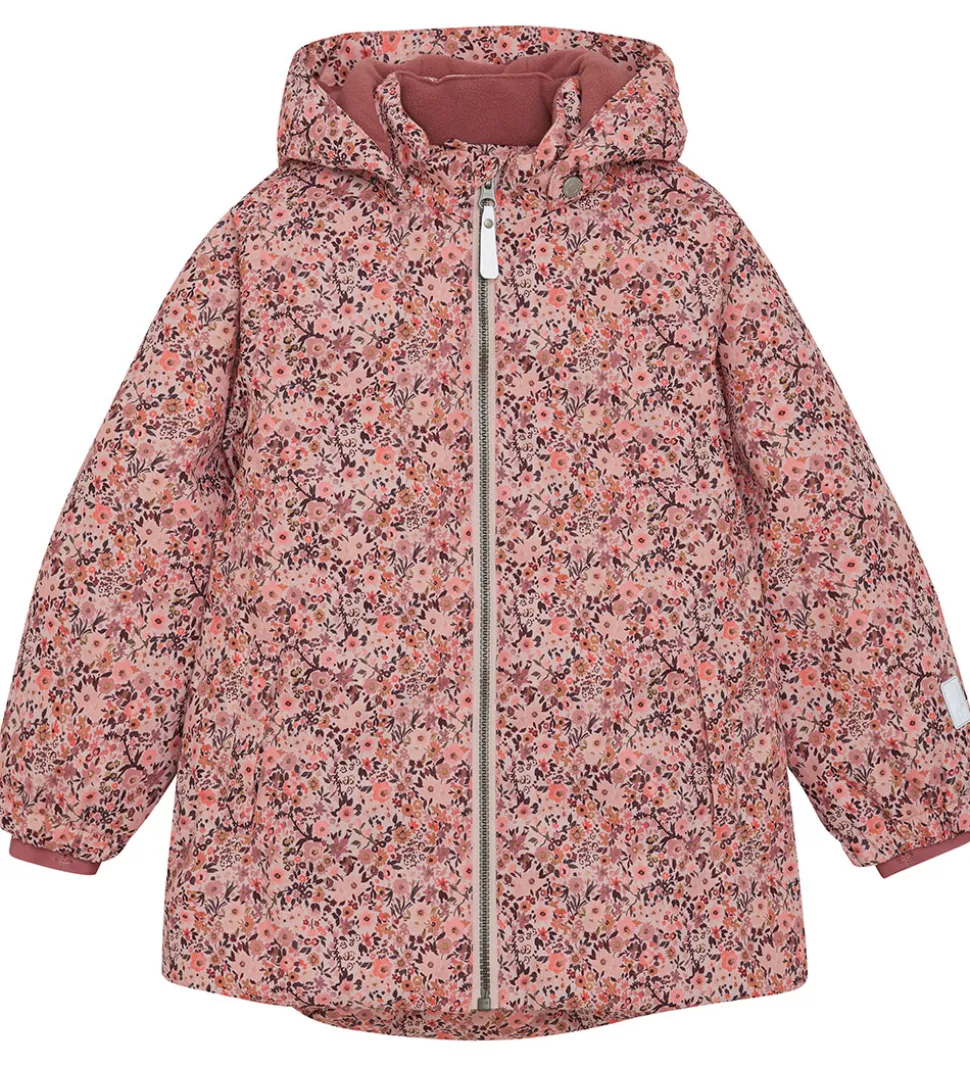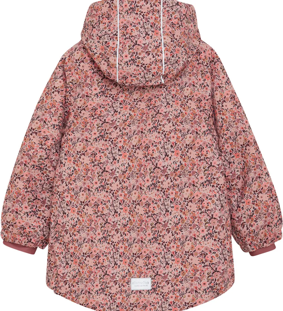 Smart Minymo vinterjakke i lys rosa med et alloverprint af blomster i rosa, lilla og brune nuancer. Vinterjakken har praktiske refleksdetaljer.