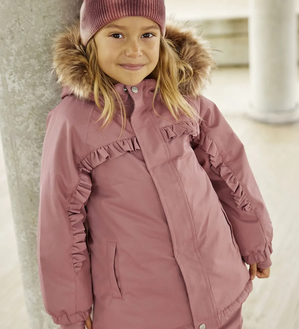 Fin Minymo vinterjakke i mørk rosa med flotte flæser fra brystet og ud på armene. Vinterjakken er også med smarte refleksdetaljer.