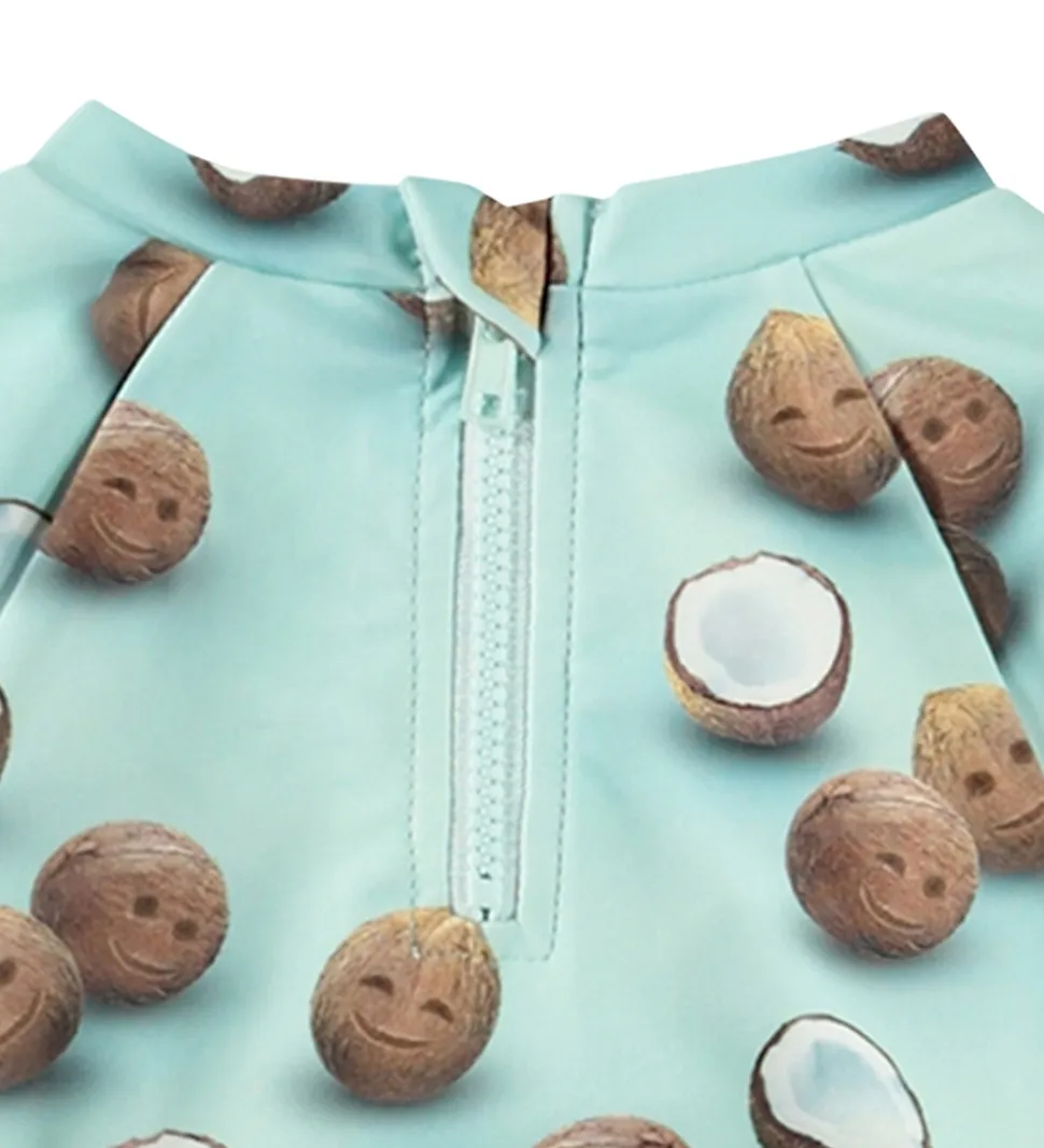 Smart Molo badebluse i lyseblå med print af kokosnødder med glade ansigter. Badeblusen har lange ærmer og en rund halsudskæring med en kort lynlås i nakken.
