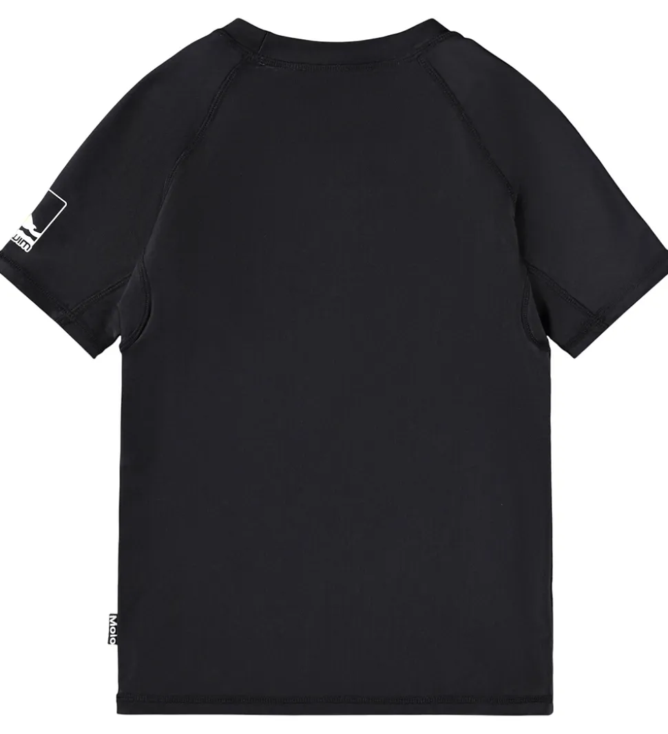 Elegant Molo badebluse i sort med et hvidt og gult logo på venstre ærme. Badeblusen har en rund halsudskæring og korte ærmer. Den har et praktisk UV-filter på 50+.