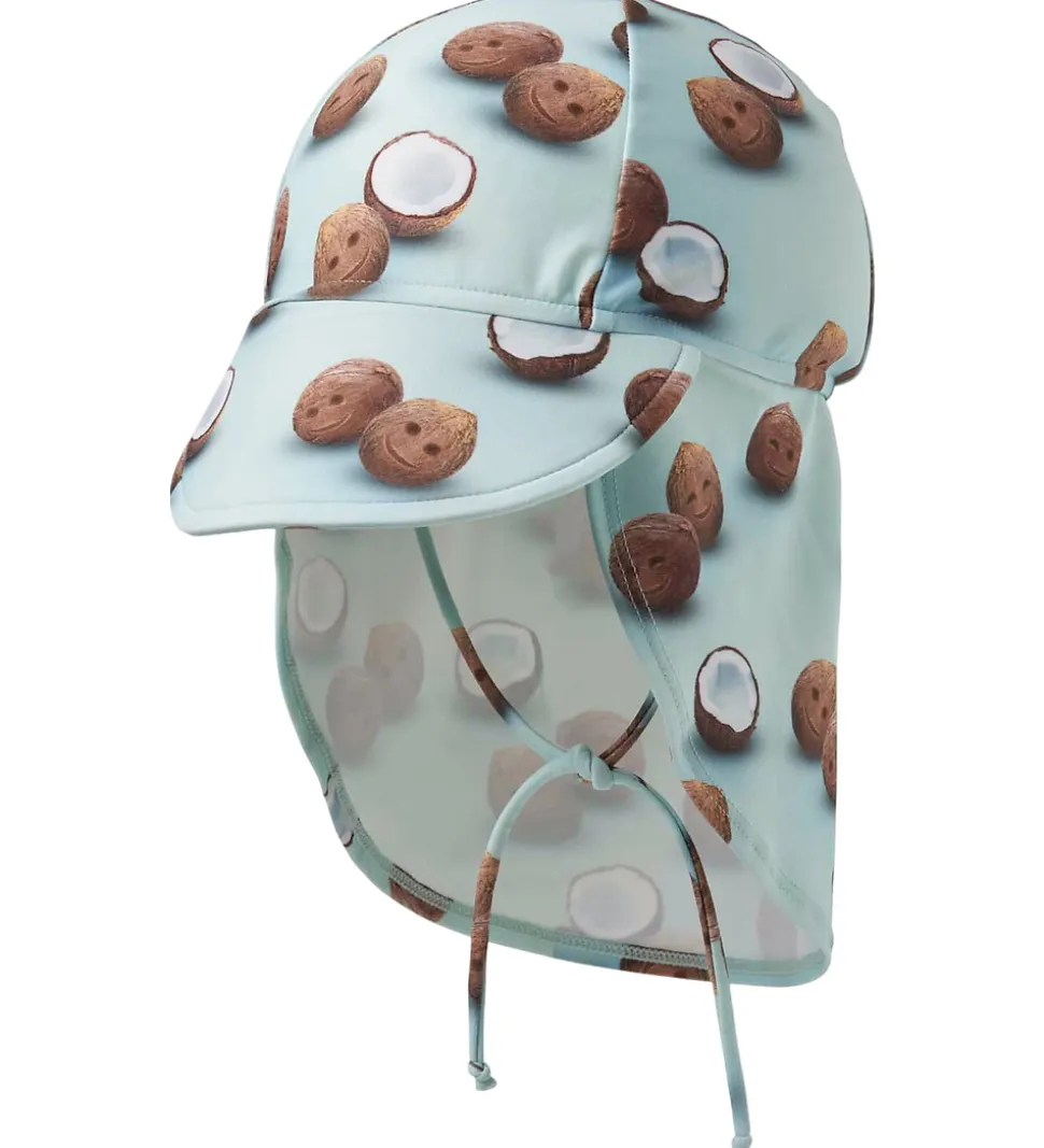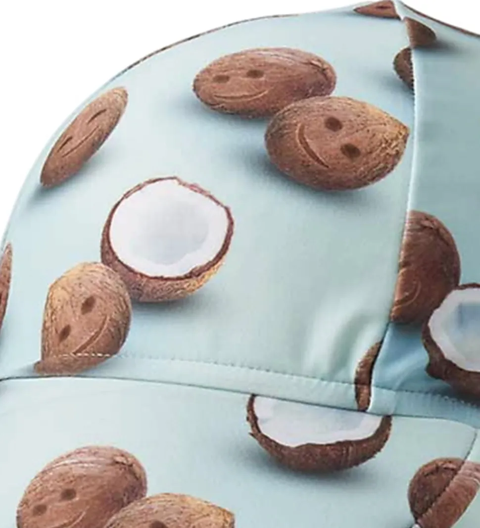 Smart badehat fra Molo i lyseblå med print af kokosnødder med glade ansigter.