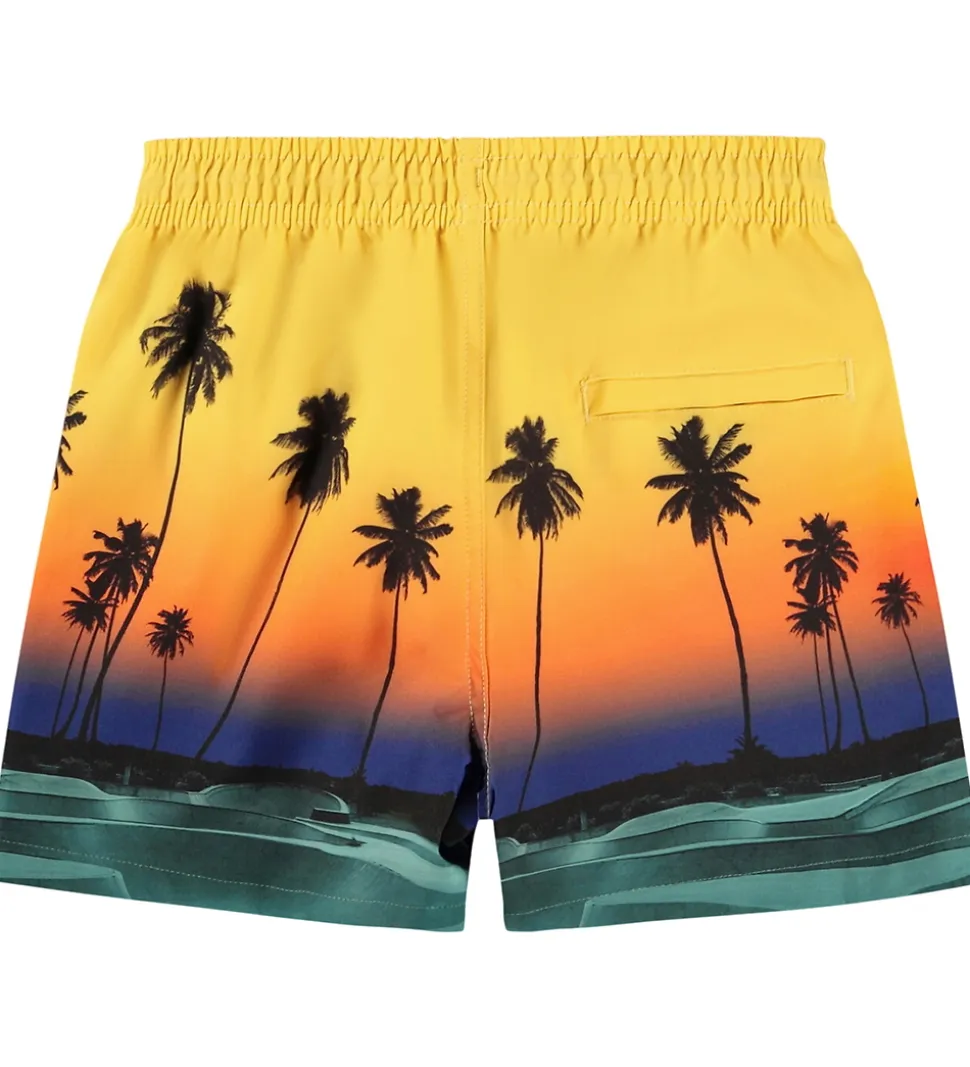 Flotte Molo badeshorts med et levende print af palmetræer og en solnedgang i nuancer af gul, orange og blå. I forgrunden ses en silhouet af en skateboarder. Molo badeshortsene har en praktisk elastisk talje med en snøre foran, der sikrer en god pasform. Indvendigt er der mesh, som giver en behagelig pasform. Badeshortsene har et praktisk UV-filter på 50+.