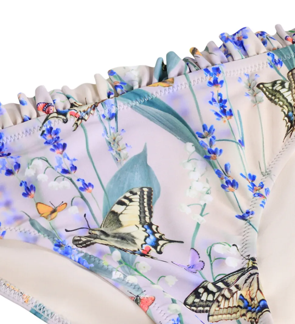Elegant Molo bikini i lys lilla dekoreret med farverige sommerfugle og blomster. Molo bikinitoppen har tynde stropper og en dekorativ flæsekant øverst. Bikinitrusserne har en flæsekant øverst og elastik i benåbningerne. Bikinien har et praktisk UV-filter på 50+.