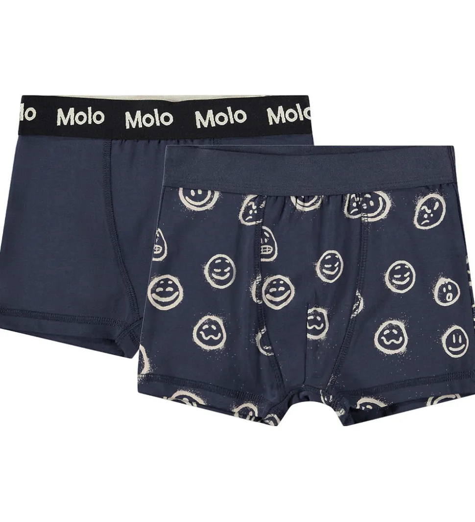 Praktiske Molo boxershorts i en pakke med to par. Det ene par er ensfarvet navy, mens det andet har et sjovt mønster med forskellige ansigter på navy baggrund. Molo boxershortsene har en elastikkant i livet, hvilket sikrer en behagelig pasform. Begge boxershorts er designet i et blødt materiale for maksimal komfort.