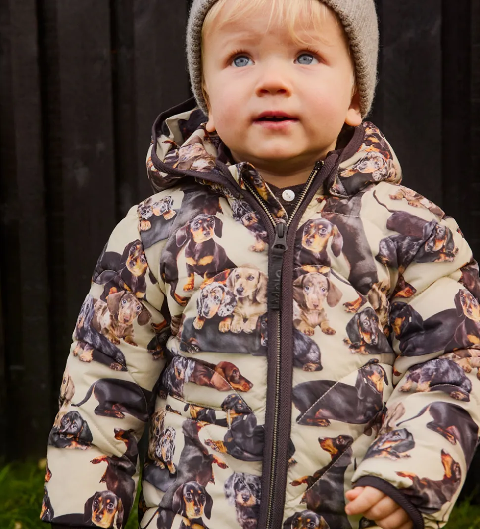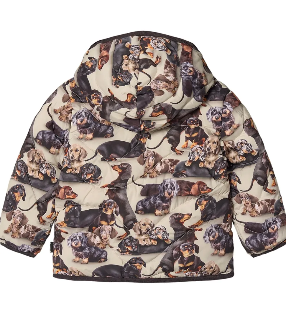 Dejlig Molo dynejakke med et unikt print af forskellige hunde, der dækker hele overfladen. Dunjakken er i nuancer af beige med sorte, beige og brune detaljer og har bølgende syninger.