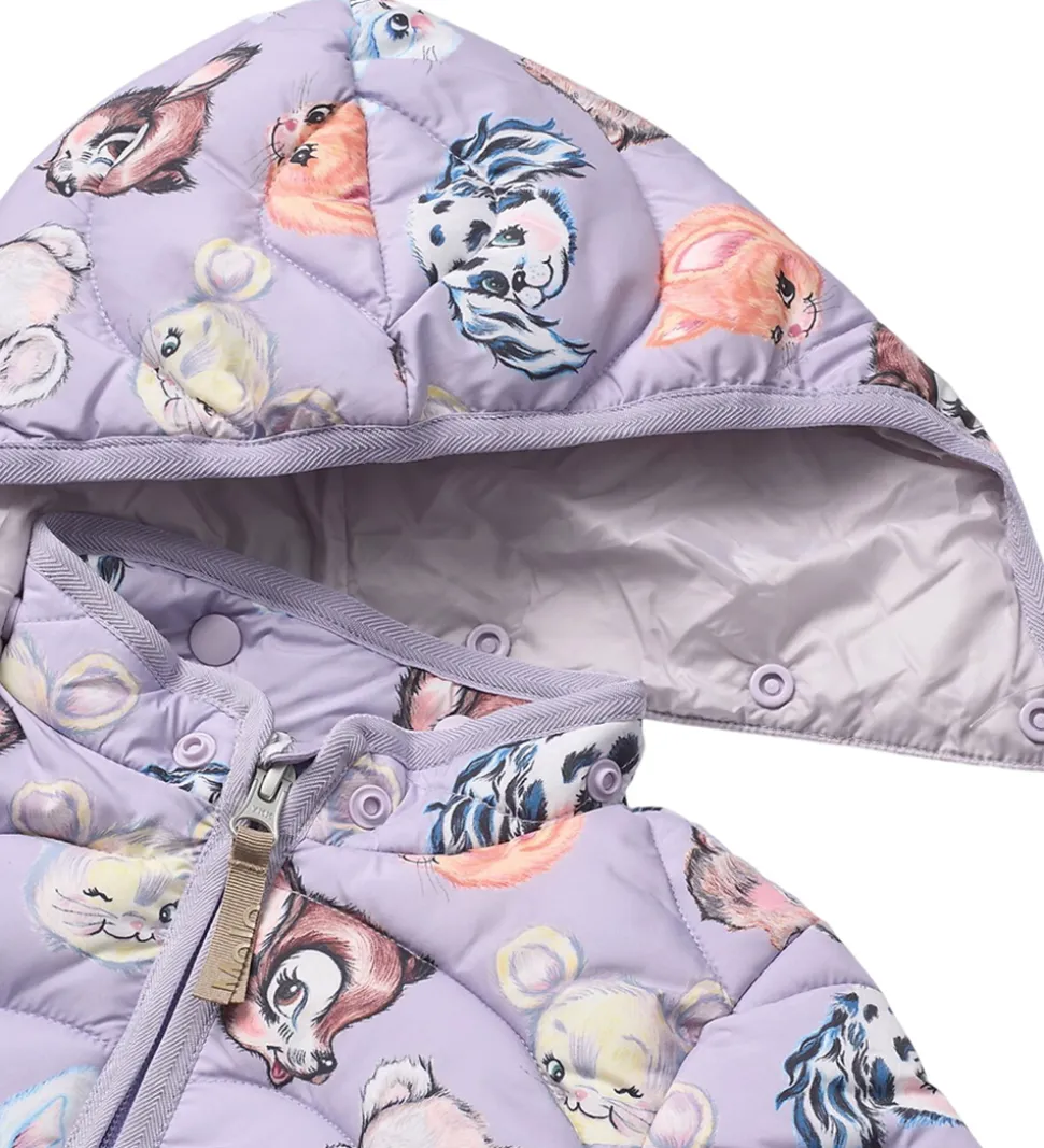 Dejlig Molo dynejakke i en lys lilla nuance med et mønster af søde dyrehoveder i forskellige farver samt bølgende syninger.