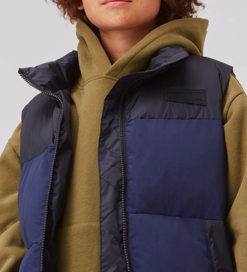 Pæn Molo dynevest i navyblå og sort med en logo-gummiapplikation på venstre bryst. Dynevesten har klassiske, vandrette syninger.