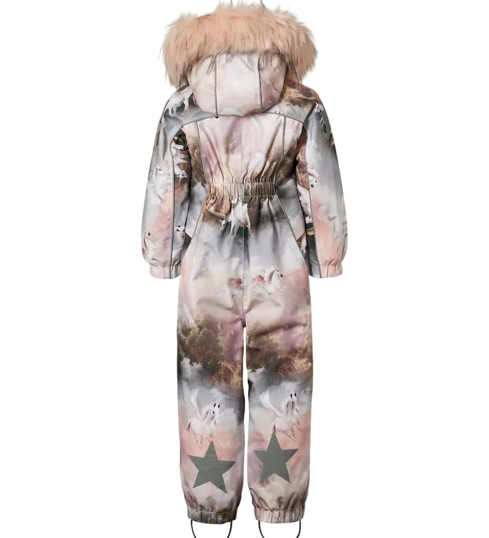 Smart Molo flyverdragt med et udtryk af rosa og grå nuancer med et smukt landskabsprint med enhjørninger. Flyverdragten er udstyret med store stjernereflekser og reflekspipings.