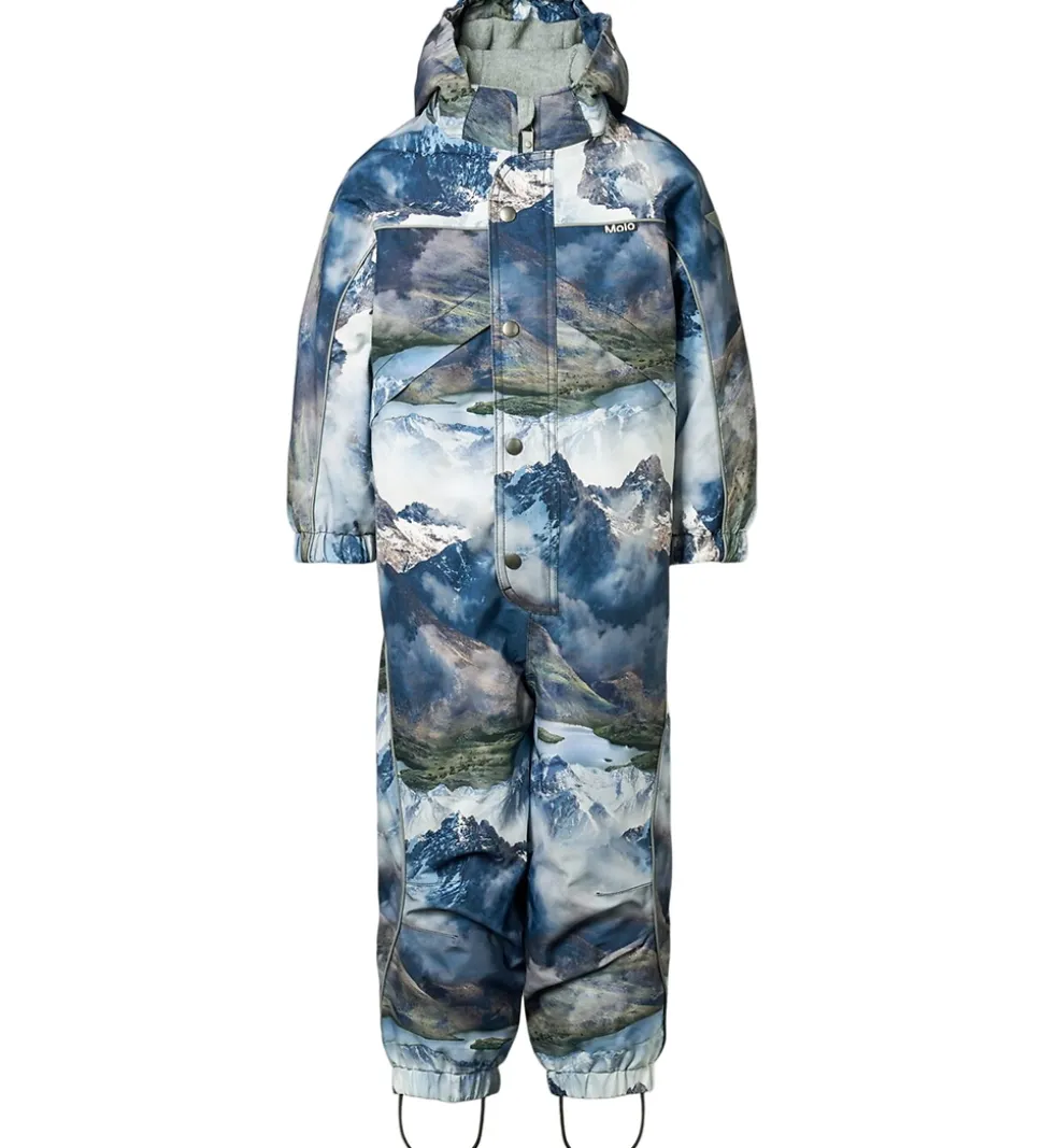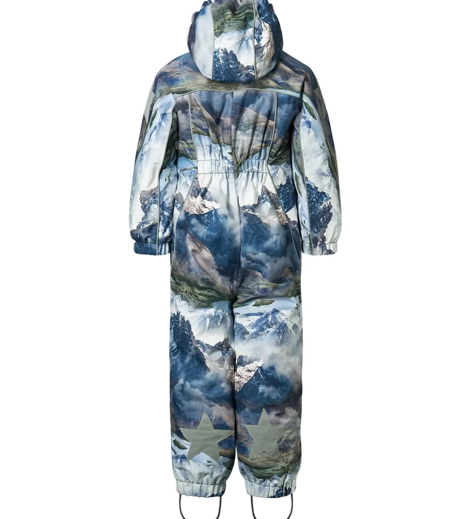 Smart Molo flyverdragt med et lyst alloverprint af et sneklædt bjerglandskab. Flyverdragten er udstyret med store stjernereflekser og reflekspipings.