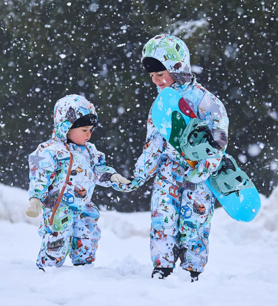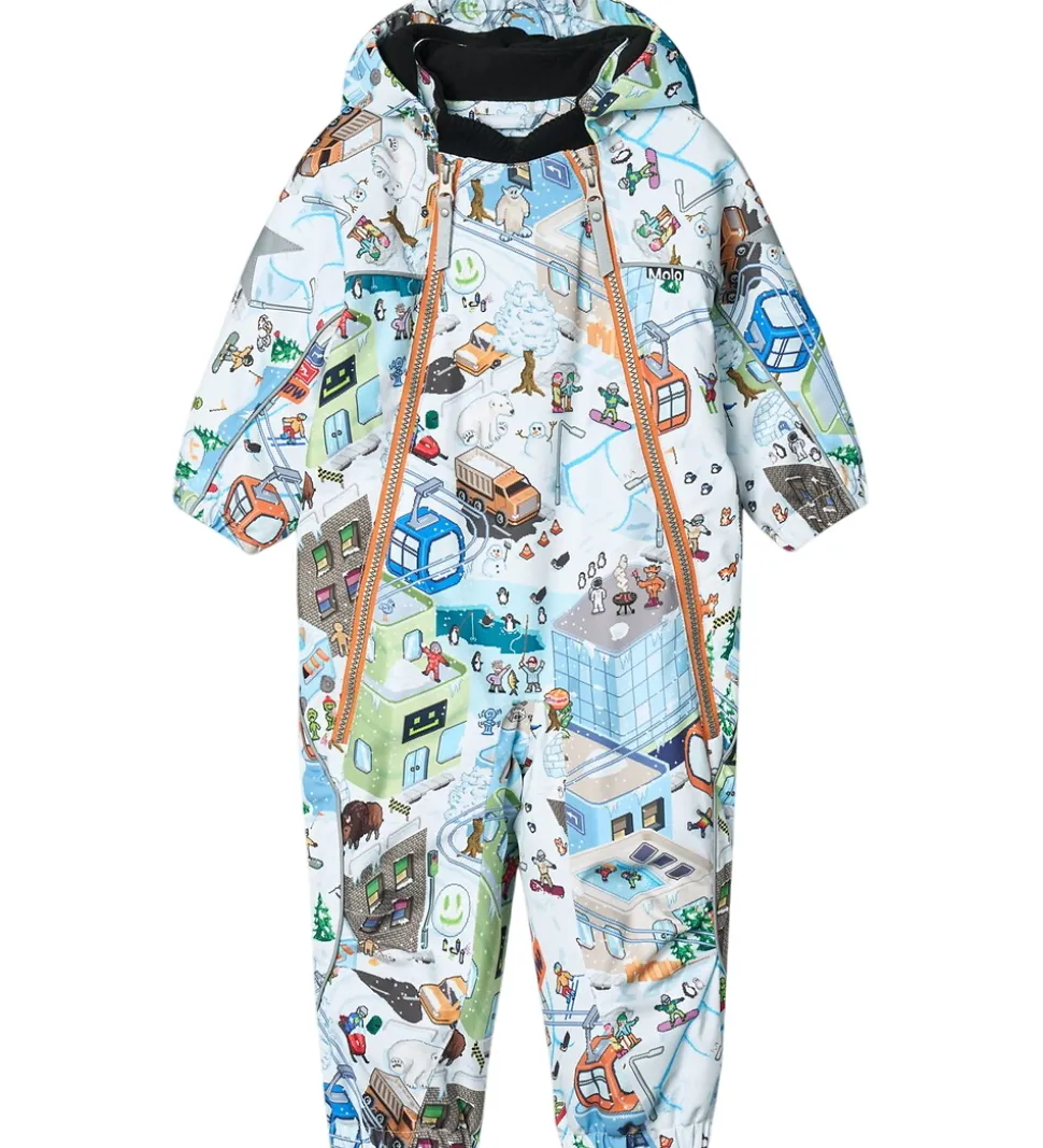 Flot Molo flyverdragt med et alloverprint af pixeleret vinterlandskab. Flyverdragten er udstyret med store stjernereflekser og reflekspipings.