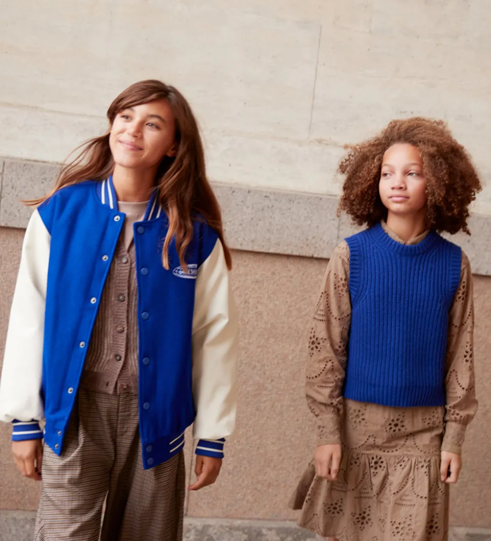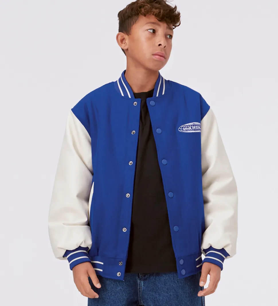 Sej Molo jakke i blå med et broderet cirkelprint på venstre bryst samt med hvide ærmer i imiteret læder.