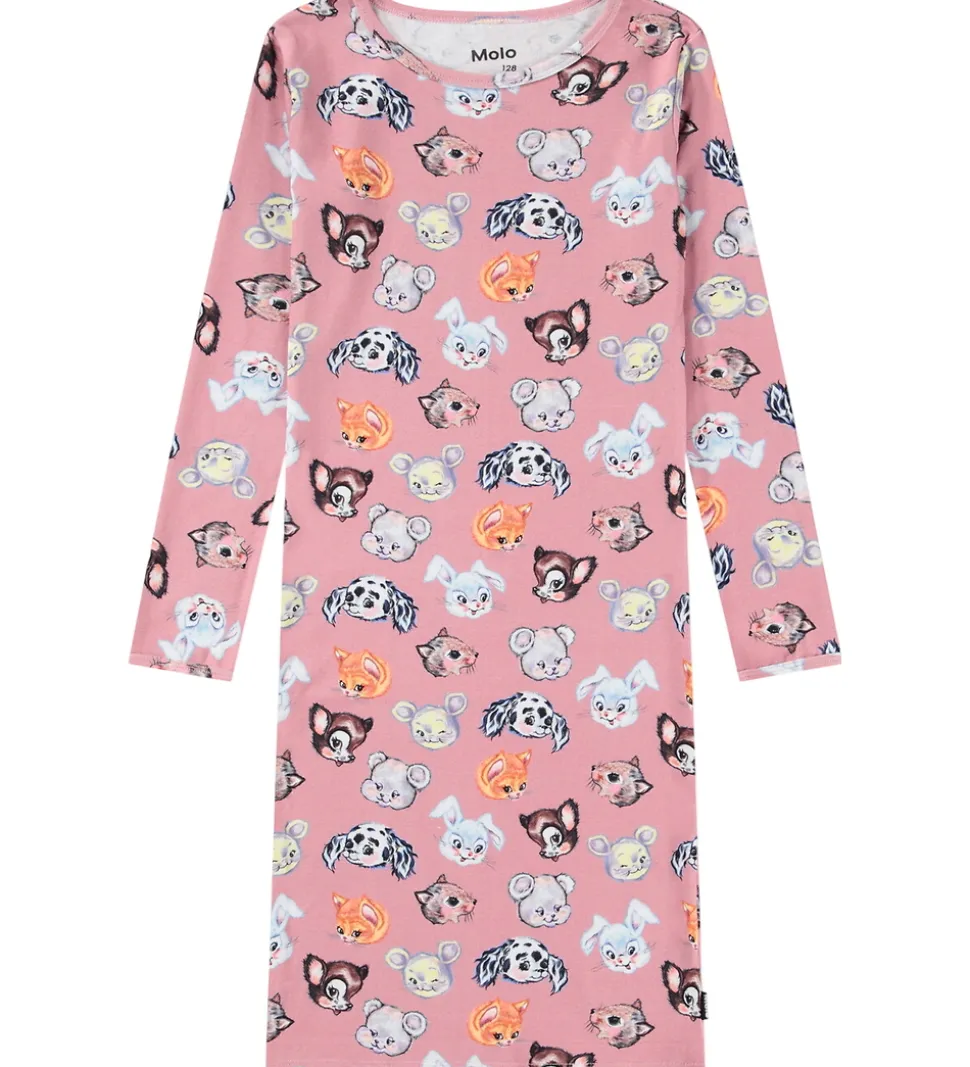 Indbydende Molo natkjole i en blød rosa nuance prydet med forskellige dyremotiver i lyse farver. Natkjolen er designet med lange ærmer og en rund halsudskæring, hvilket giver en enkel og funktionel stil.