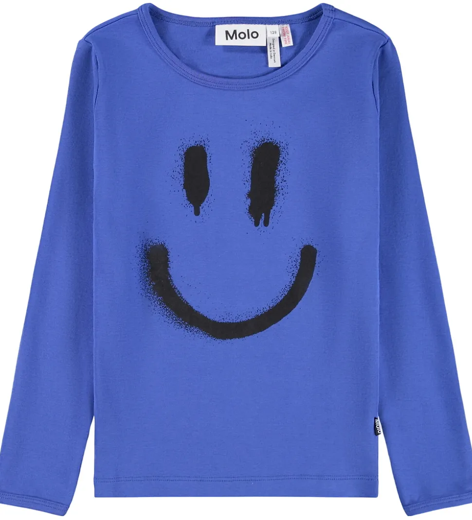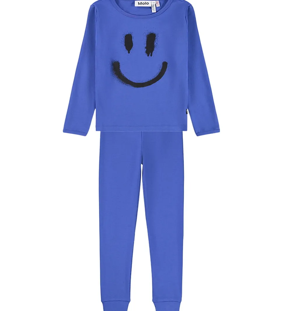 Flot Molo nattøj 2-delt i en klar blå farve. Molo nattøjet har en bluse med lange ærmer og et stort sort smileyprint på fronten, der tilføjer et sjovt element.