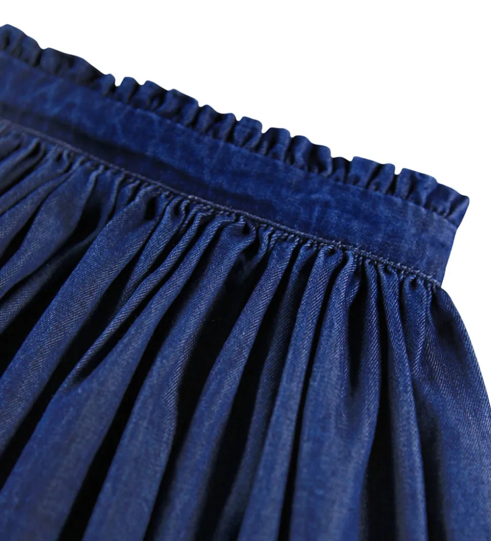 Charmerende Molo nederdel i denimblå med fine, hvide broderier langs nederste kant. Molo nederdelen har elastik i taljen, som sikrer en god pasform.