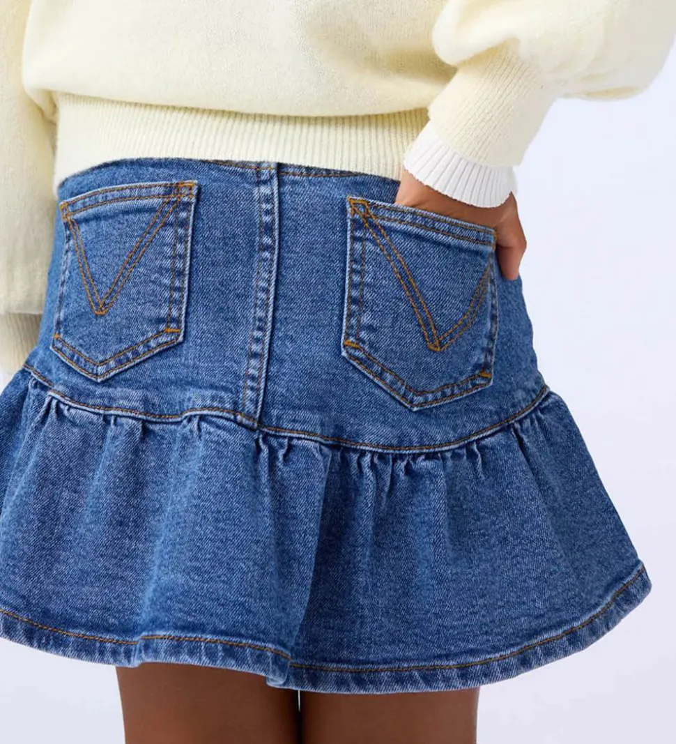 Stilren Molo nederdel i klassisk denimlook. Molo nederdelen har et charmerende A-formet design med flæsekant nederst. Nederdelen er udstyret med praktiske bæltestropper og lukkes med en enkelt knap i taljen. Indvendigt kan taljen justeres med knapper.