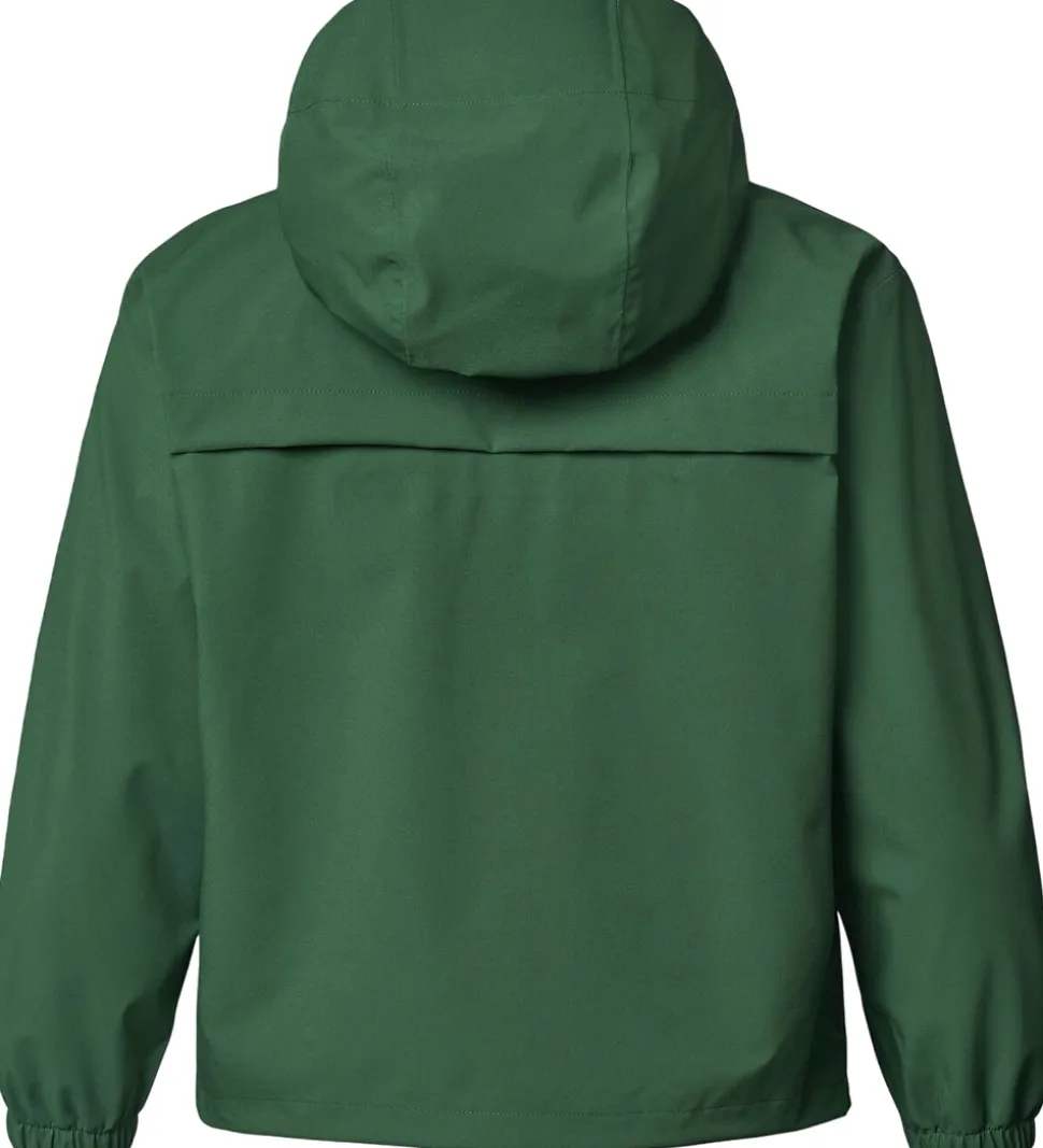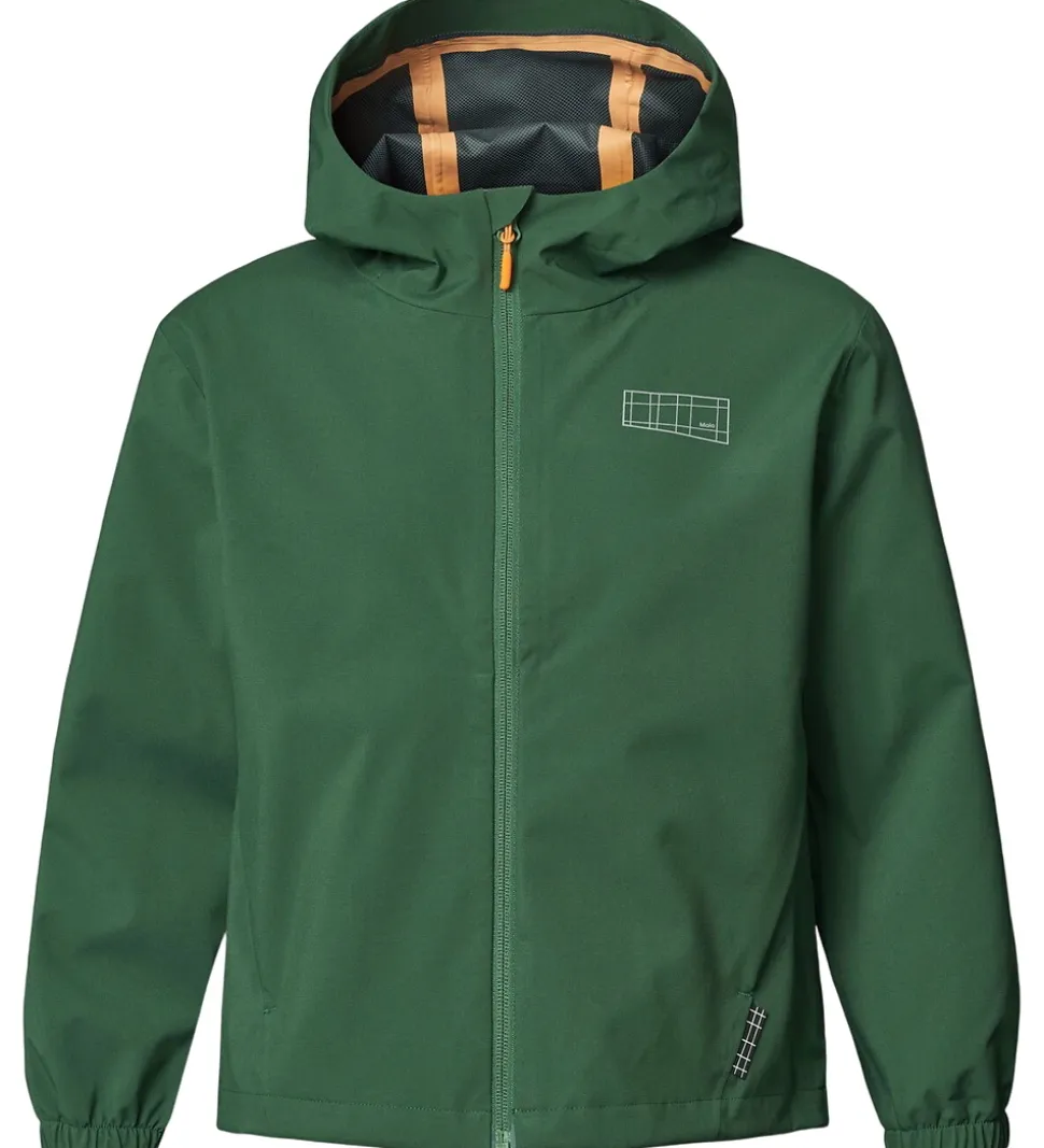 Fin Molo regnjakke af PE i grøn og med orange lynlås-vedhæng. På venstre bryst er der et logorefleksprint, og indvendigt er der orange detaljer i form stropper og tapede sømme.