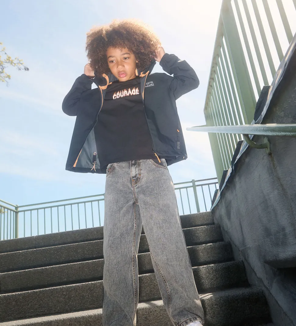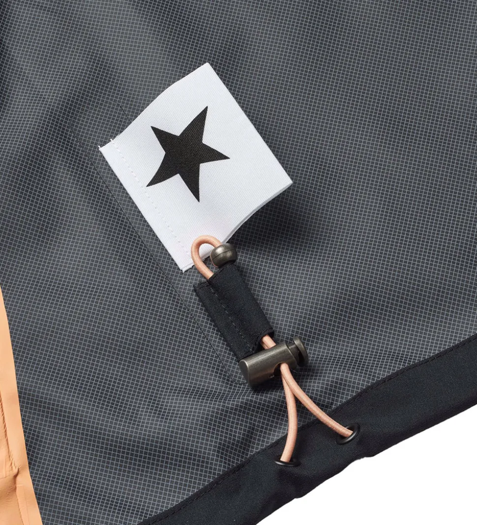 Fin Molo regnjakke af PE i sort og med orange lynlås-vedhæng. På venstre bryst er der et logorefleksprint, og indvendigt er der orange detaljer i form stropper og tapede sømme.