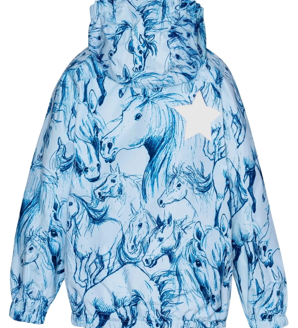 Skøn Molo regnjakke af PE i lyseblå med et iøjnefaldende hesteprint. Regnjakken er desuden udstyret med en gummi-logoapplikation på venstre bryst og en stor, reflekterende Molo-stjerne på højre skulderblad.