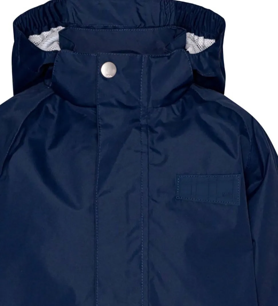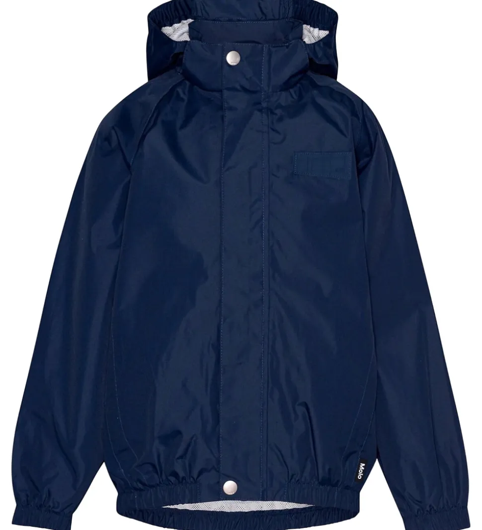 Molo regnjakken har en aftagelig hætte, som er påsat med skjult velcro, og en høj hals. Hætten har en skygge i toppen og elastikkanter i siderne. Regnjakkens ærmer og og livåbning har også praktiske elastikkanter.