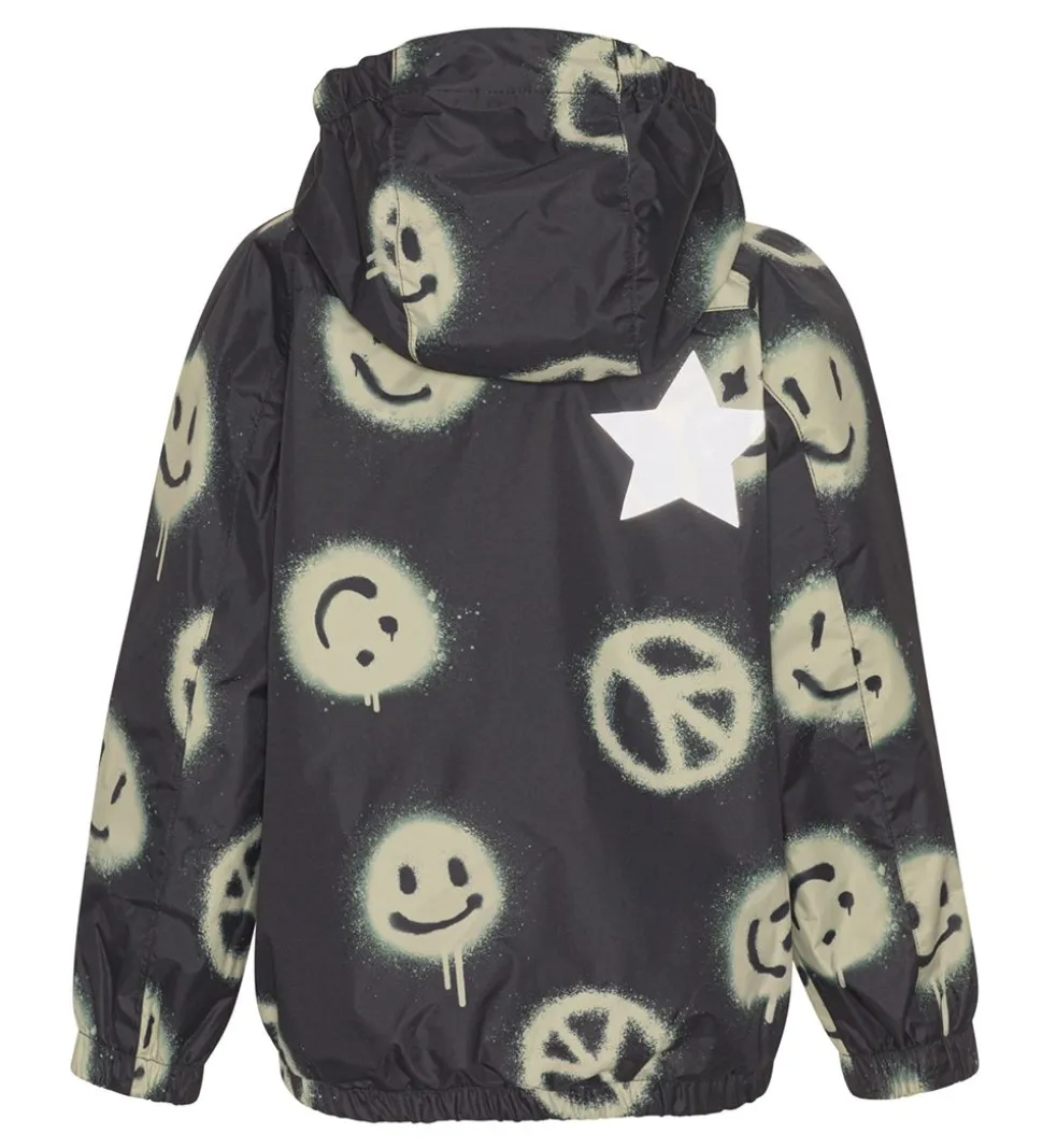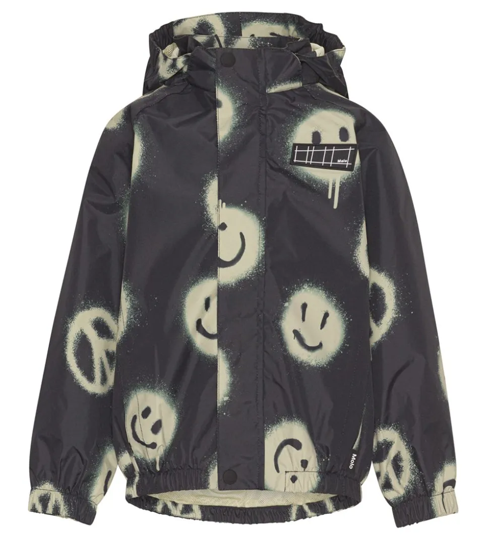 Sej Molo regnjakke i sort med et alloverprint af smileys i et beige grafitti-design samt med en gummi-logoapplikation på venstre bryst. Regnjakken er desuden udstyret med en stor, reflekterende Molo-stjerne på højre skulderblad.