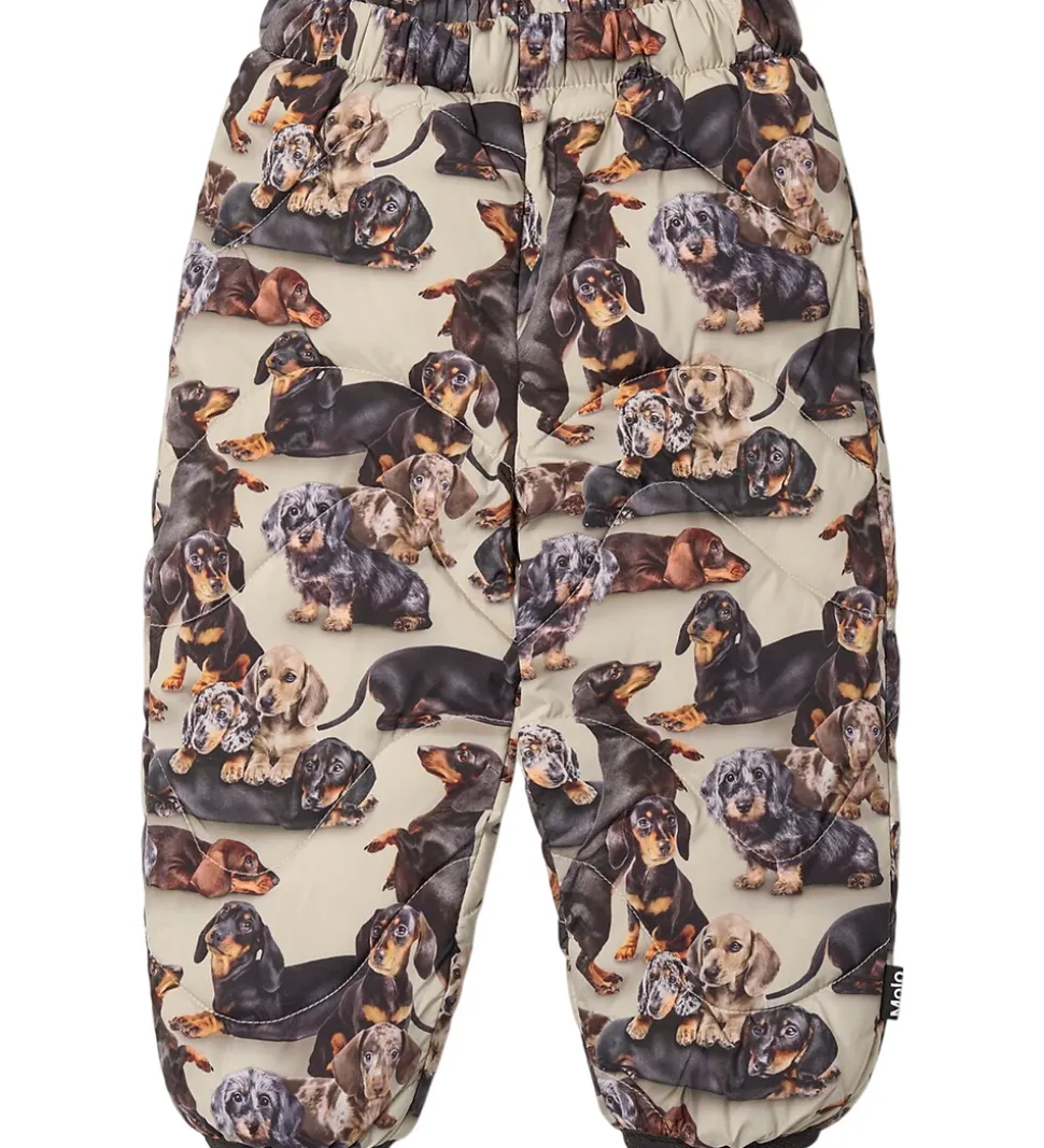 Dejlige Molo skibukser med et unikt print af forskellige hunde, der dækker hele overfladen. Skibukserne er i nuancer af beige med sorte, beige og brune detaljer og har bølgende syninger.
