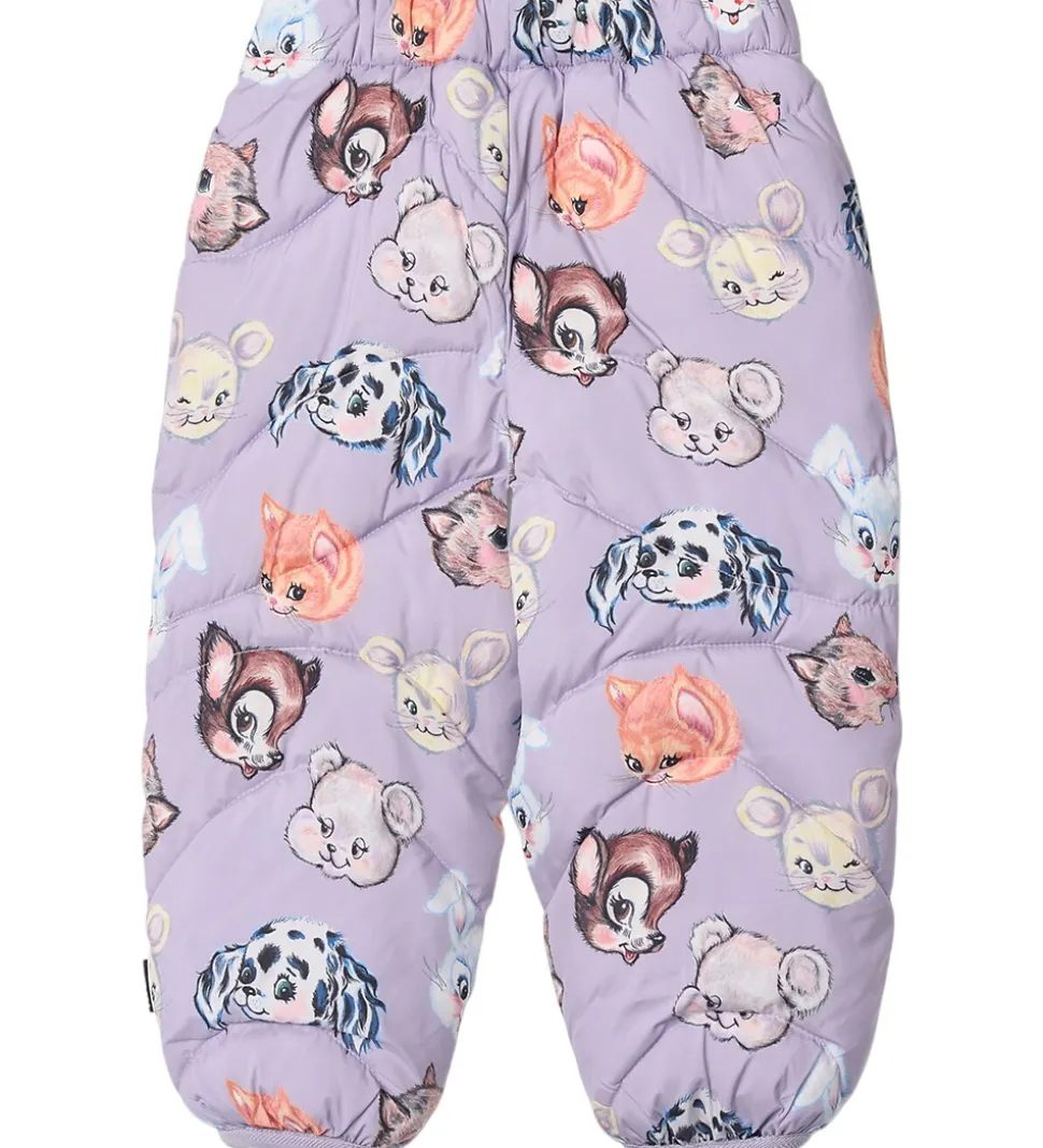Dejlige Molo skibukser i en lys lilla nuance med et mønster af søde dyrehoveder i forskellige farver samt bølgende syninger.