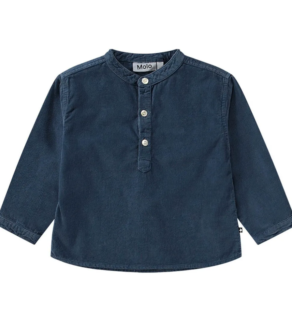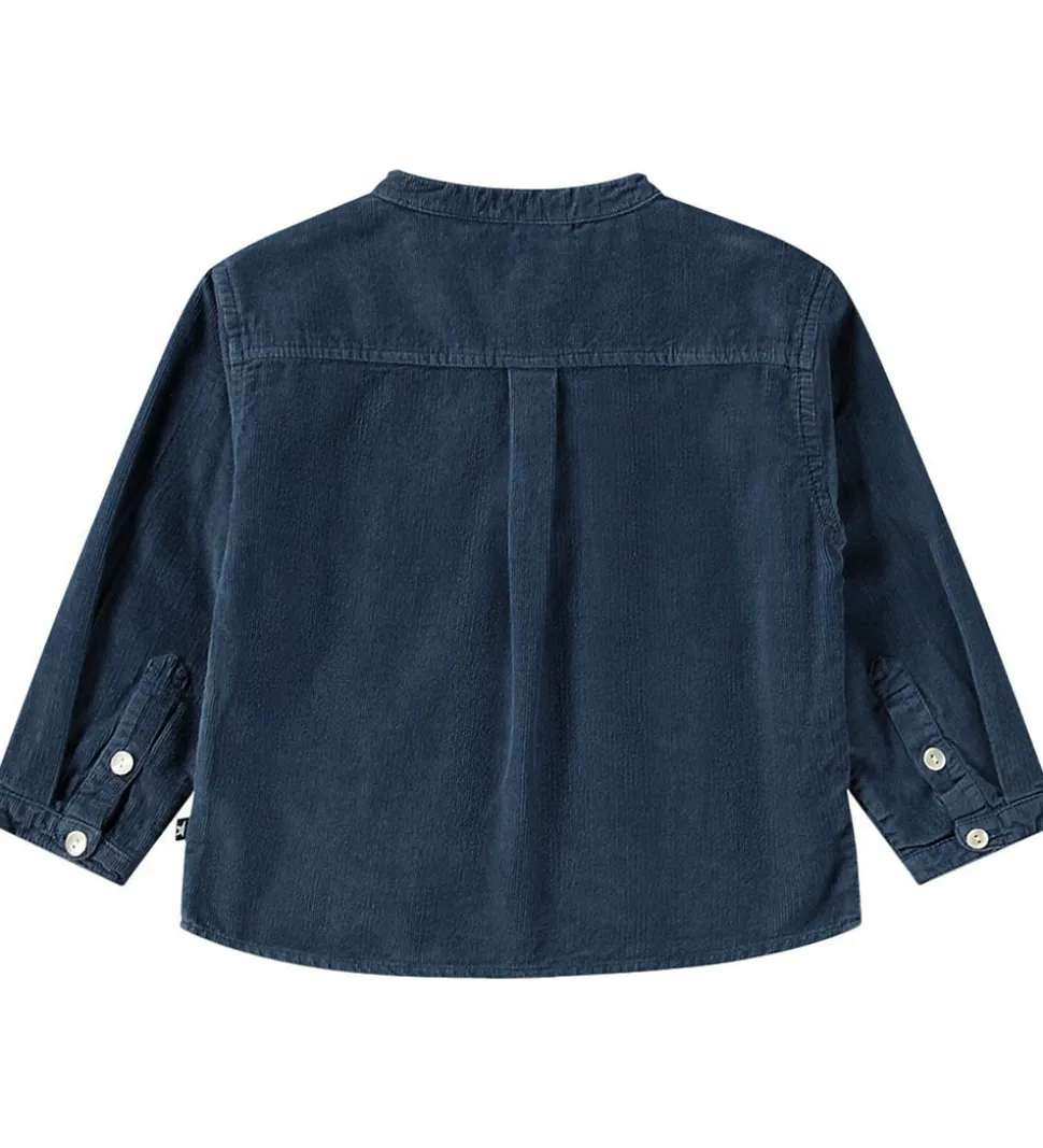 Flot Molo skjorte i mørkeblå fløjl. Molo skjorten lukkes fortil med tre knapper. Skjorten har lange ærmer med smalle kanter, og en manchetknap. Skjorten er i en blød bomuldskvalitet.