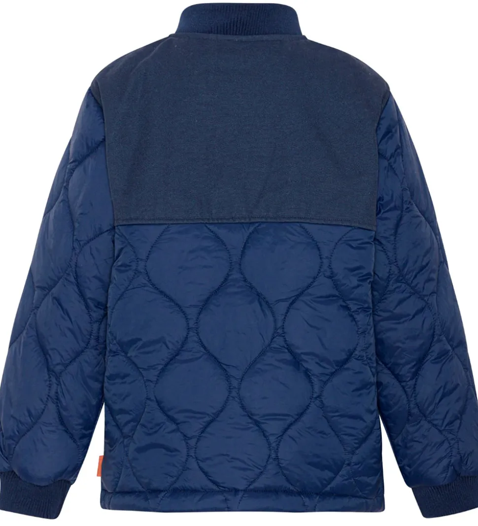 Sej Molo sommerjakke i navy, med en quiltet struktur. Fortil er der en mørkeblå del i venstre side af halsen som fortsætter bagpå i toppen. Indenvendigt er jakken i en fin støvet grøn.