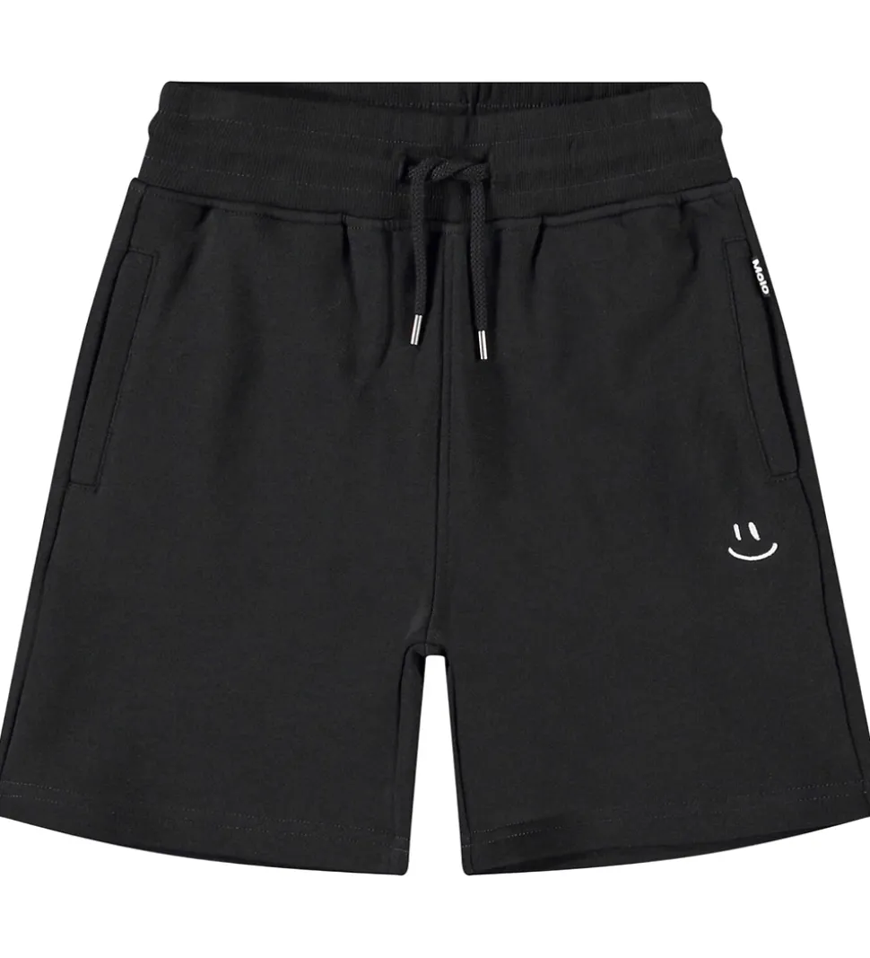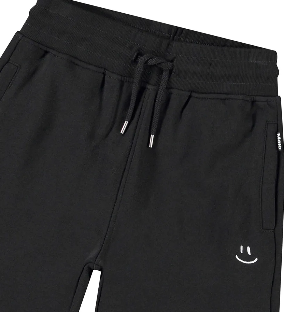 Stilfulde Molo sweatshorts i en klassisk sort farve med en diskret smiley-detalje på benet, der tilføjer personlighed. Molo shortsene har en elastisk talje med rib og snører for justerbar pasform og praktiske lommer i siderne. Bagpå sidder der en snydelomme.