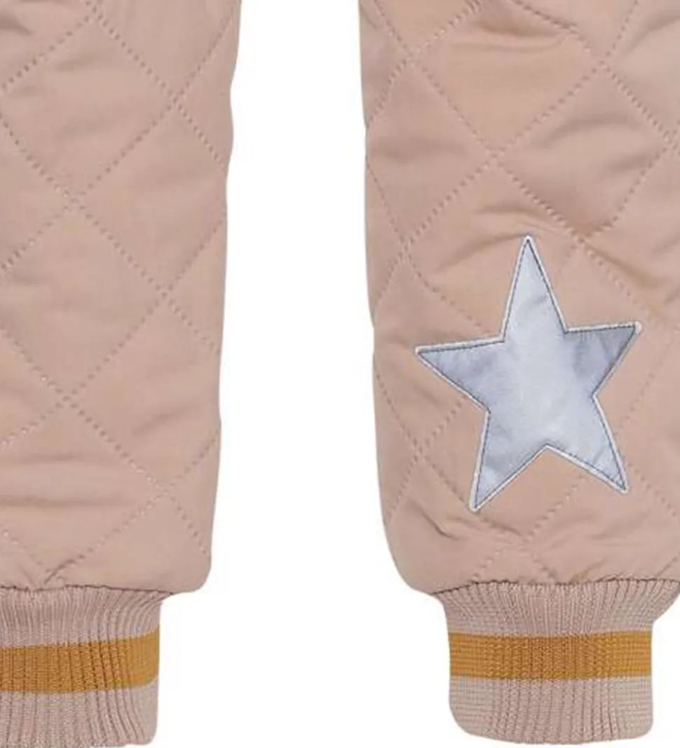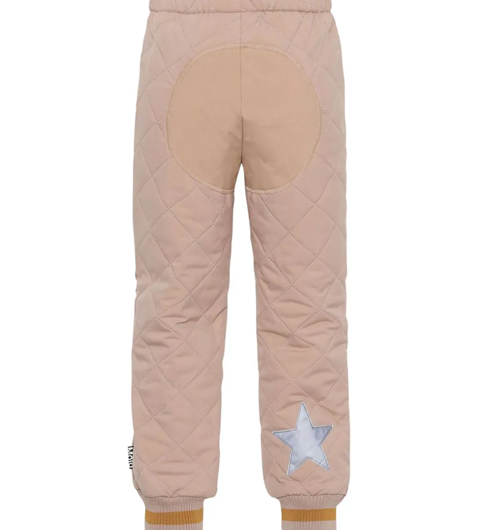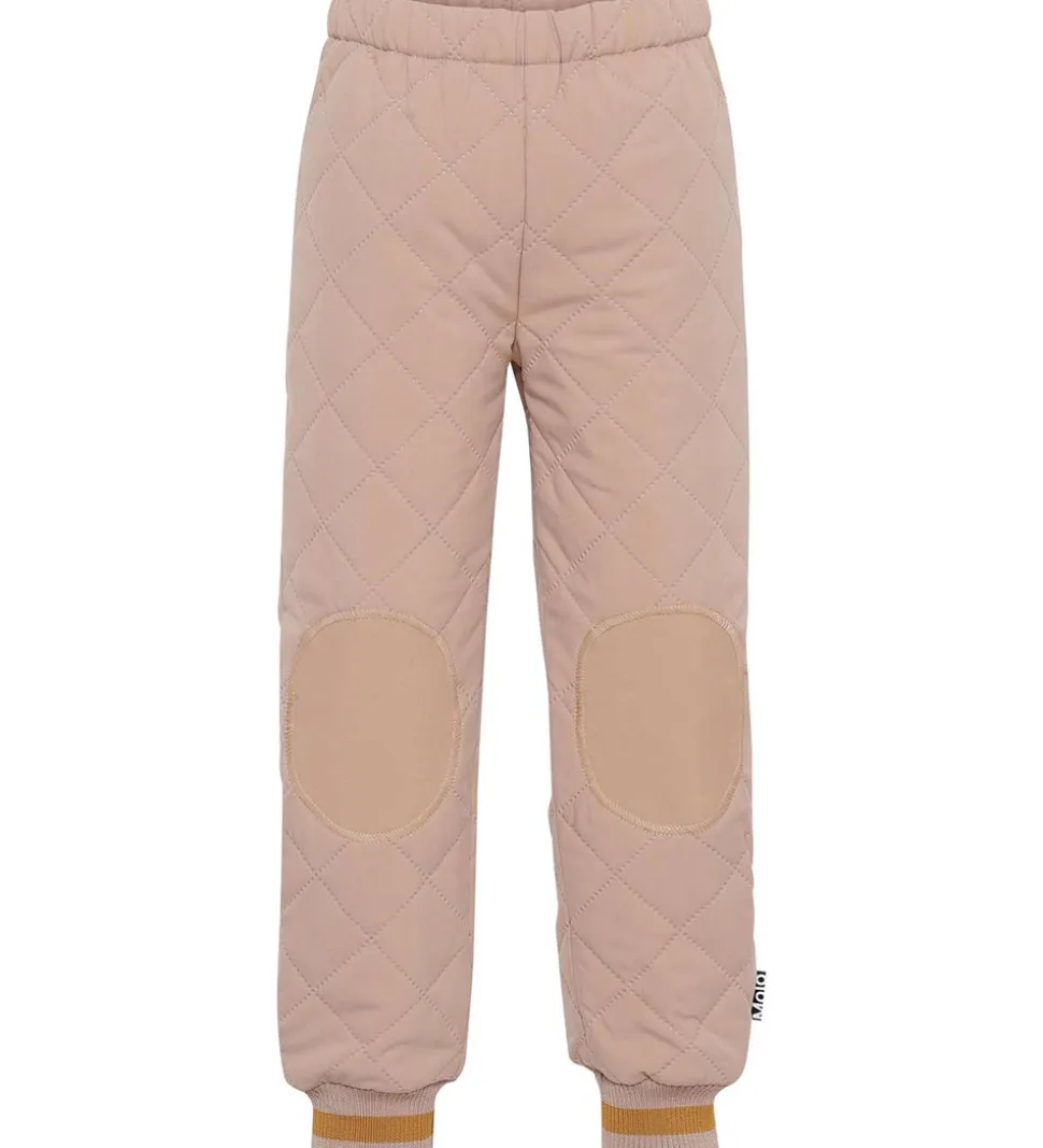 Fine Molo termobukser i rosa med et quiltet mønster og med gyldenbrune striber på ribkanterne. Indvendigt er der et gyldenbrunt for.