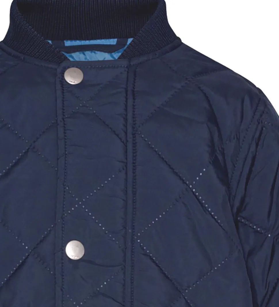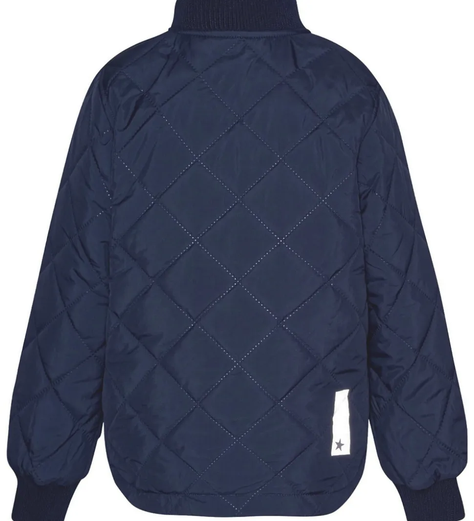 Skøn Molo termojakke i mørkeblå med et quiltet mønster, og indvendigt er den i en fin lyseblå farve.