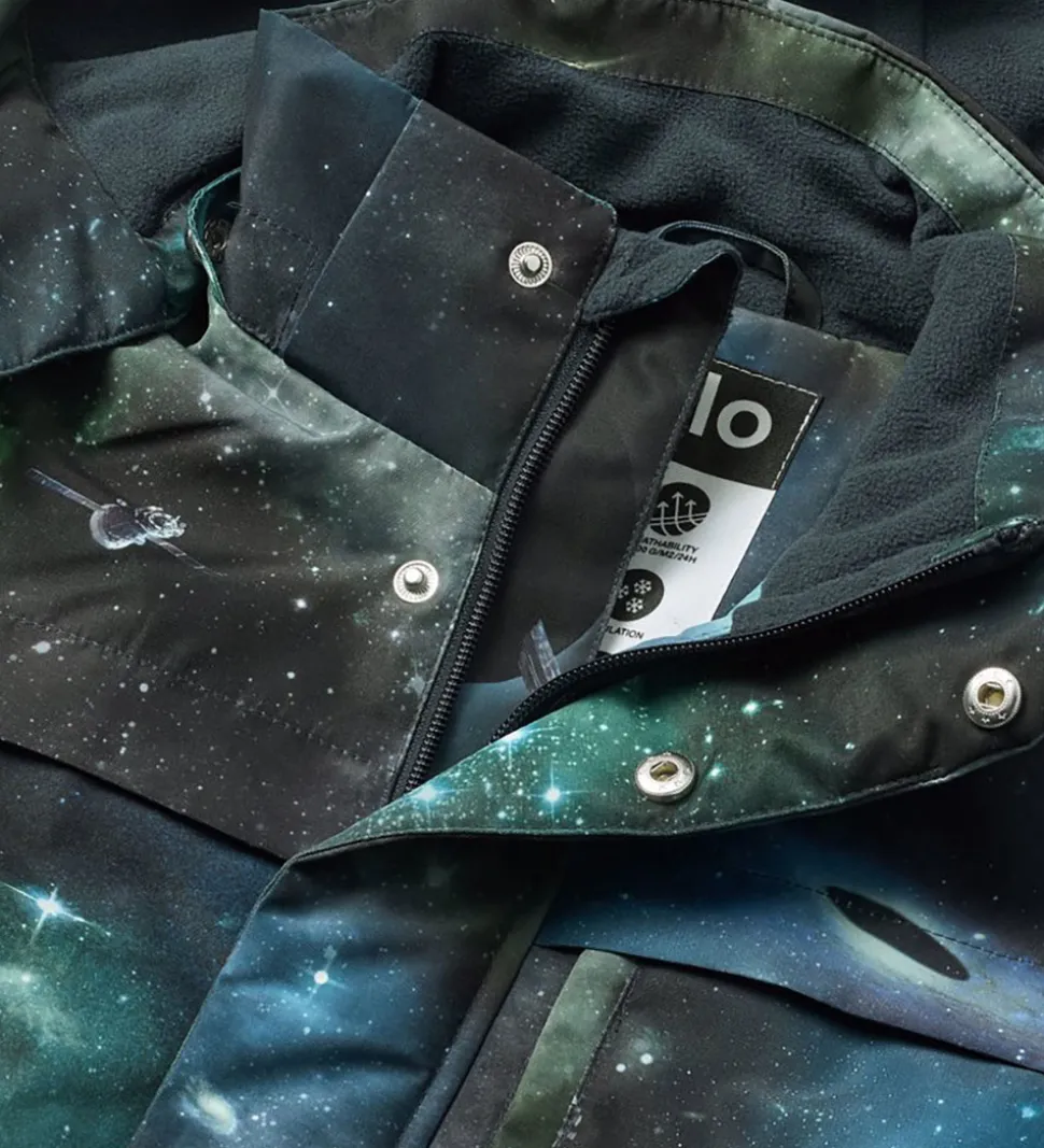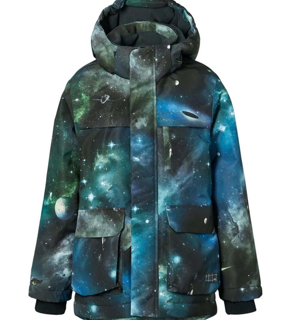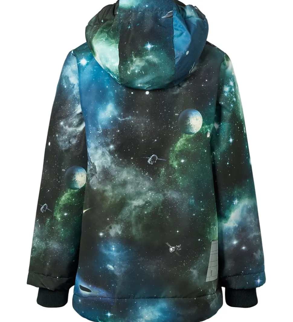 Skøn Molo vinterjakke med et fascinerende universprint i blå og grønne nuancer.