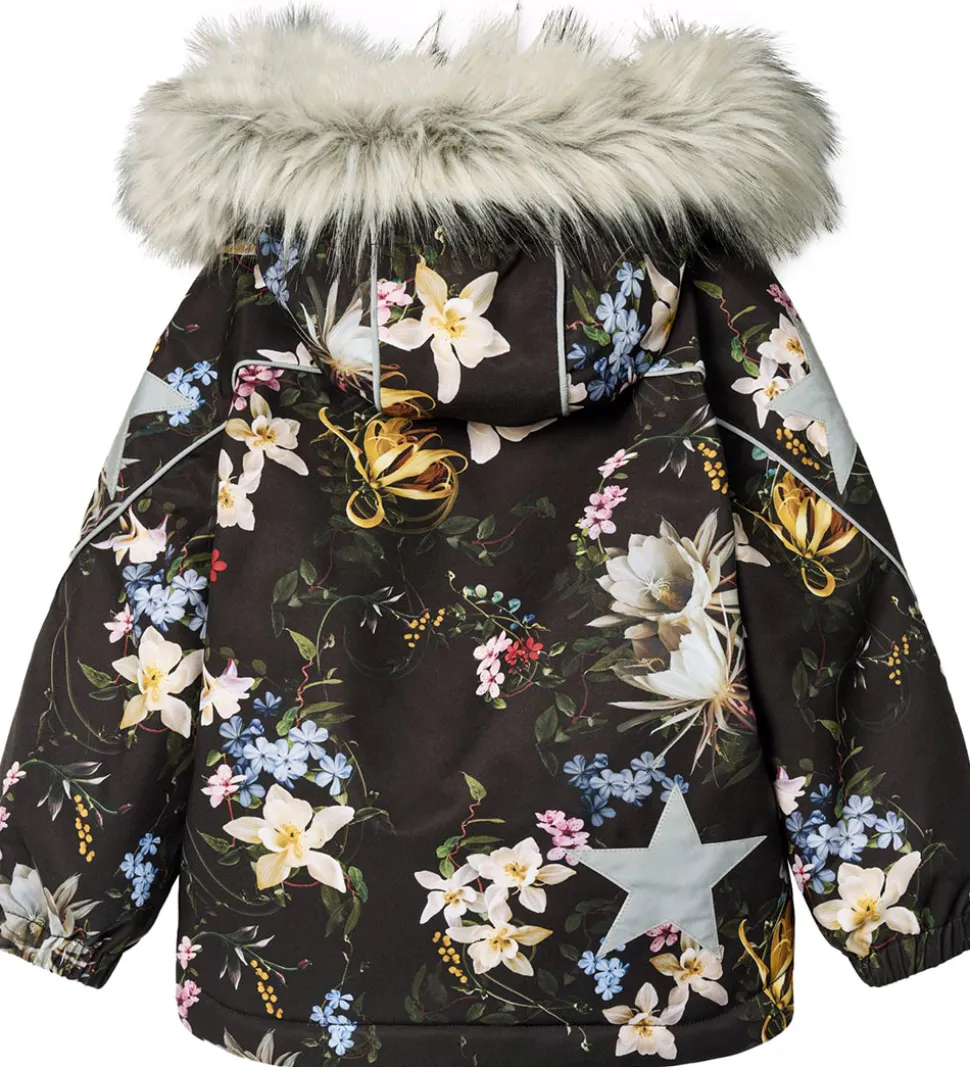 Skøn Molo vinterjakke i sort med et smuk og farverigt alloverblomsterprint samt med logoreflekser og reflekspipings.