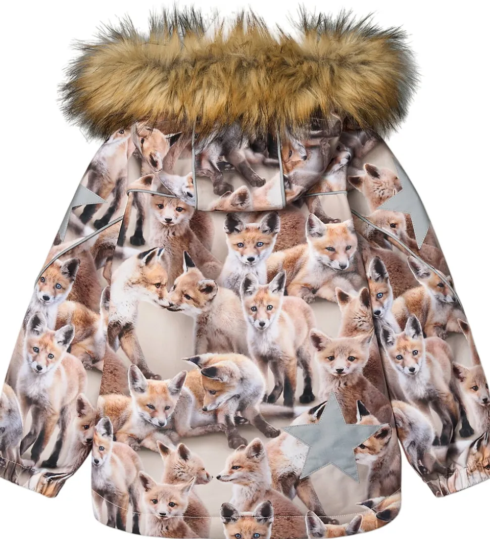Skøn Molo vinterjakke med et hyggeligt alloverprint af legende ræve samt med logoreflekser og reflekspipings.