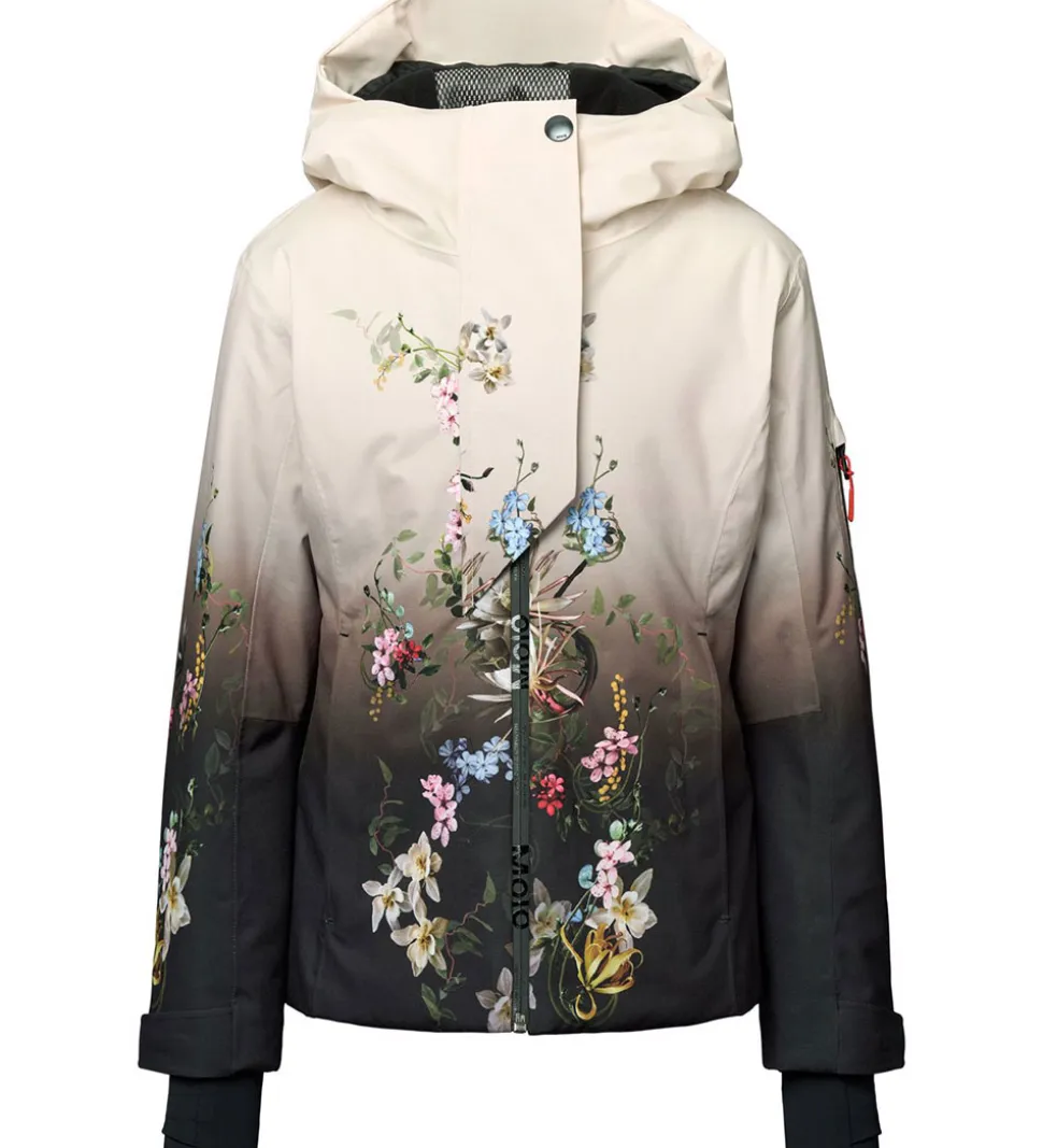 Flot Molo vinterjakke, som fra top til bund toner sig fra sort til beige og har et smukt, farverigt blomsterprint og praktiske refleksprint på højre overarm og nederst på ryggen.