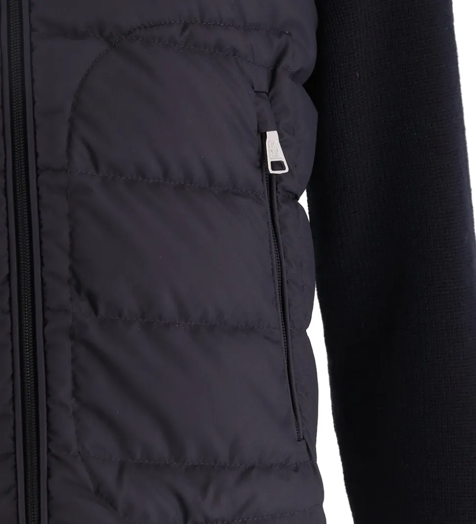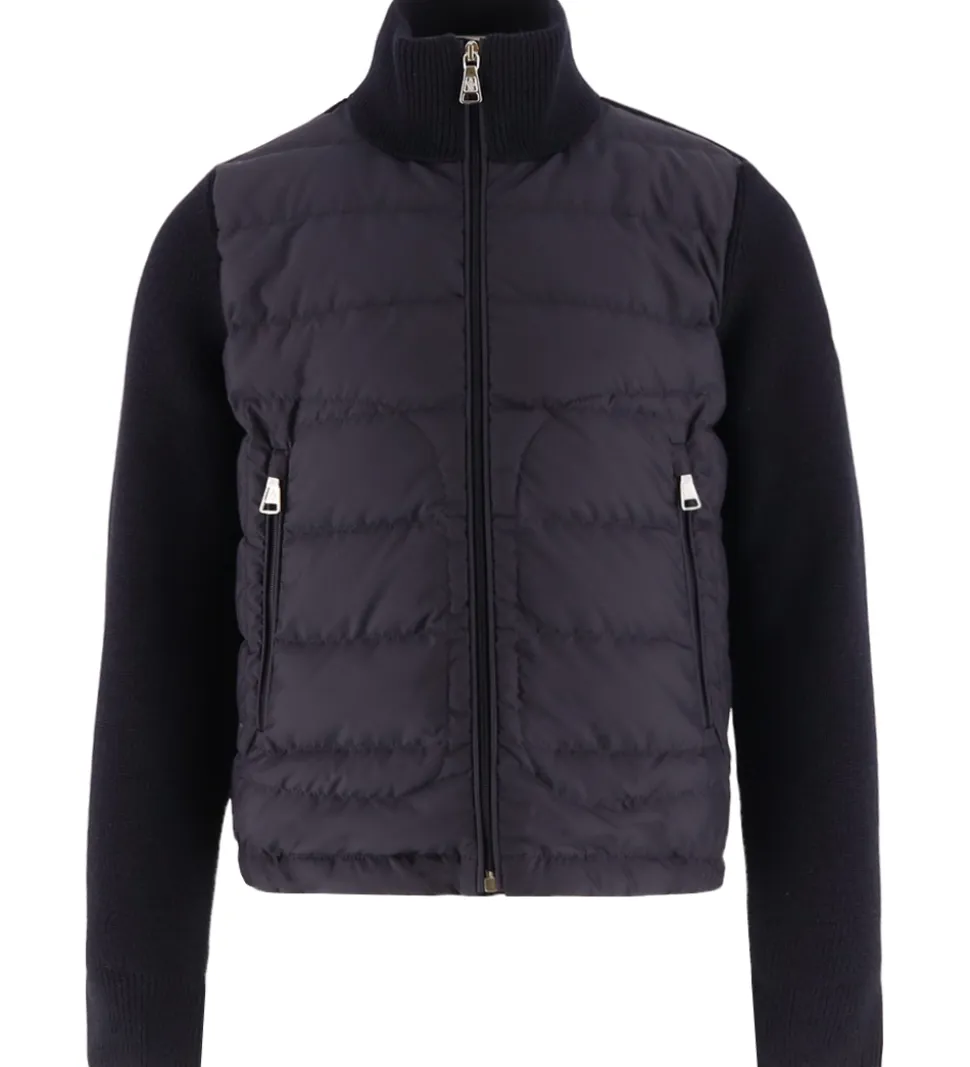 Moncler cardiganen er lavet i en strikket, ny og ren uldkvalitet, og hele fronten er lavet i en dunvatteret polyesterkvalitet med dekorative syninger, så den får et dunjakke-look.