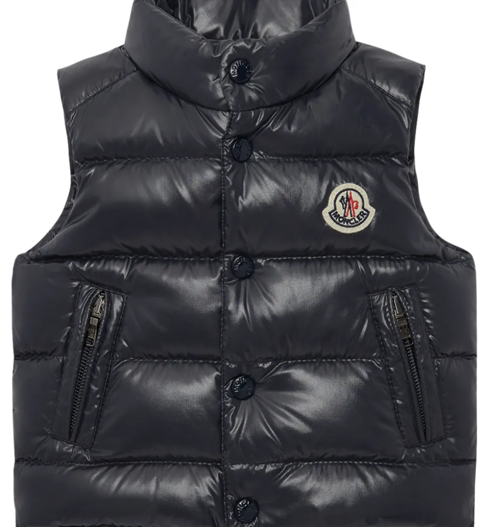 Lækker Moncler dunvest i ensfarvet navy med et hvidt filtmærke med et logo i ventre side.