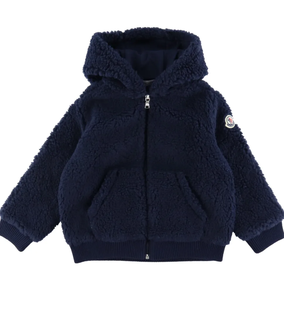 Lækker Moncler fleecejakke i ensfarvet navy teddyfleece, og på ryggen er der broderet et stort logo.