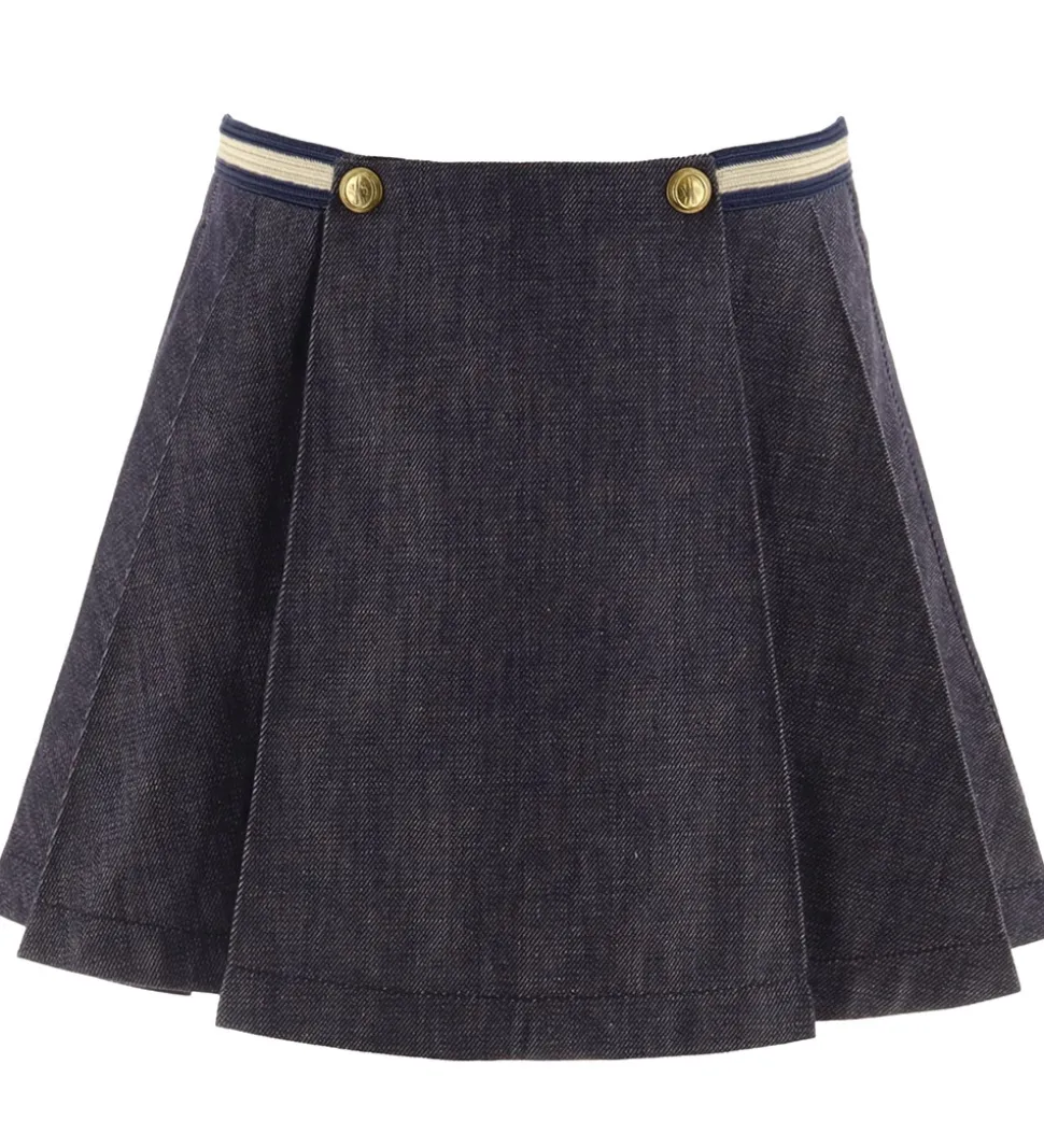 Flot Moncler nederdel i mørkeblå denim i en fastvævet kvalitet, og i livet er der en guldfarvet stribe med navy kanter.