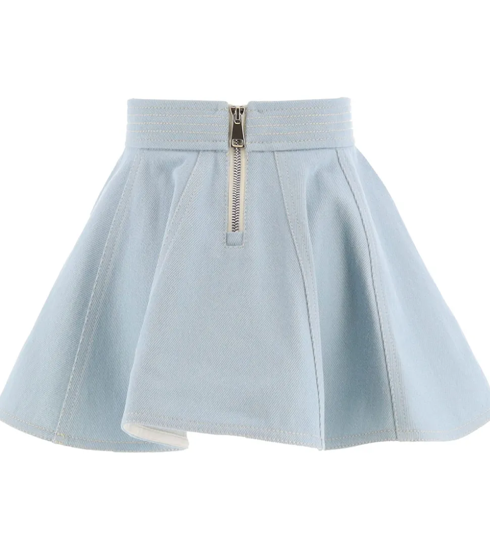 Elegant Moncler nederdel i lyseblåt denim med hvide syninger.