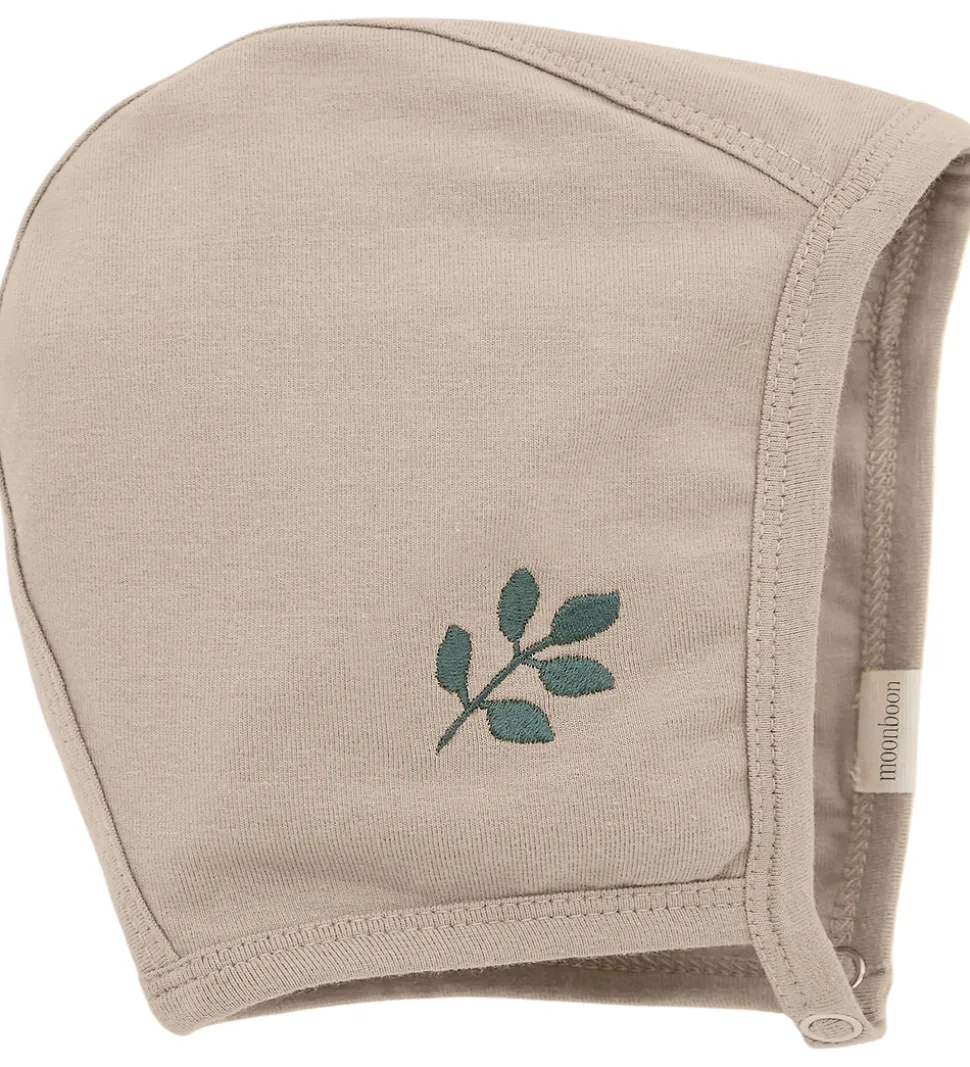 Dejlig Moonboon natdragt med babyhjelm i beige med en broderet bladgren. Moonboon natdragten med babyhjelm leveres i en fin gaveæske.